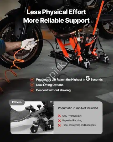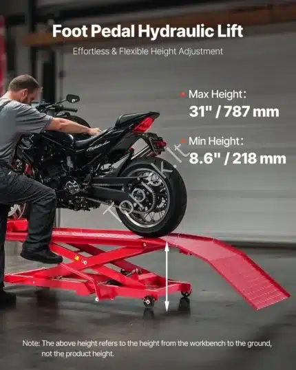 Didelė keliamoji galia: jei reikia pakelti motociklą techninės priežiūros ir valymo darbams, galite dirbti su hidrauliniu motociklo domkratu. Motociklo domkratas