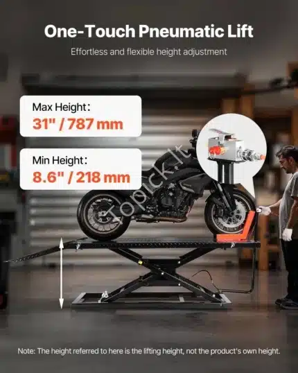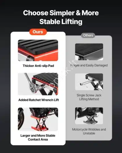 Didelė keliamoji galia: jei reikia pakelti motociklą atliekant techninės priežiūros ir valymo darbus, galite pasikliauti motociklo žirkliniu keltuvu. Dėl keliamosios