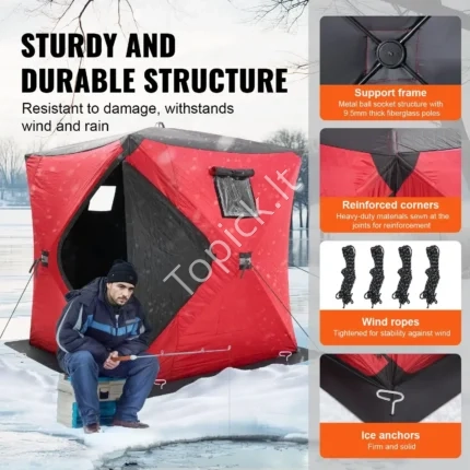 Didelė Termo Ledo Žvejybos Palapinė 3-4 Asmenims, 600D Audinys, Raudona, Išmatavimai 180x180x200 cm Žvejyba žiemą neturi reikšti drebulio nuo šalčio!