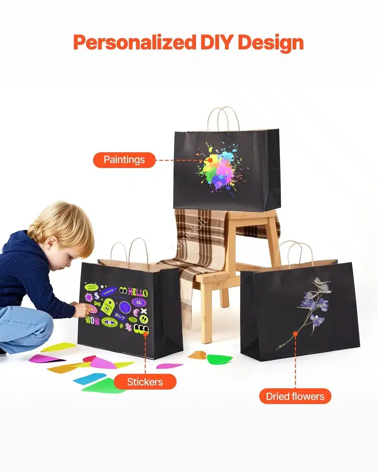 - Kūryba (DIY): Paprasta juoda spalva leidžia maišelius dekoruoti lipdukais, piešiniais, sausomis gėlėmis ar kitomis kūrybinėmis priemonėmis, taip išryškinant savo unikalų stilių.