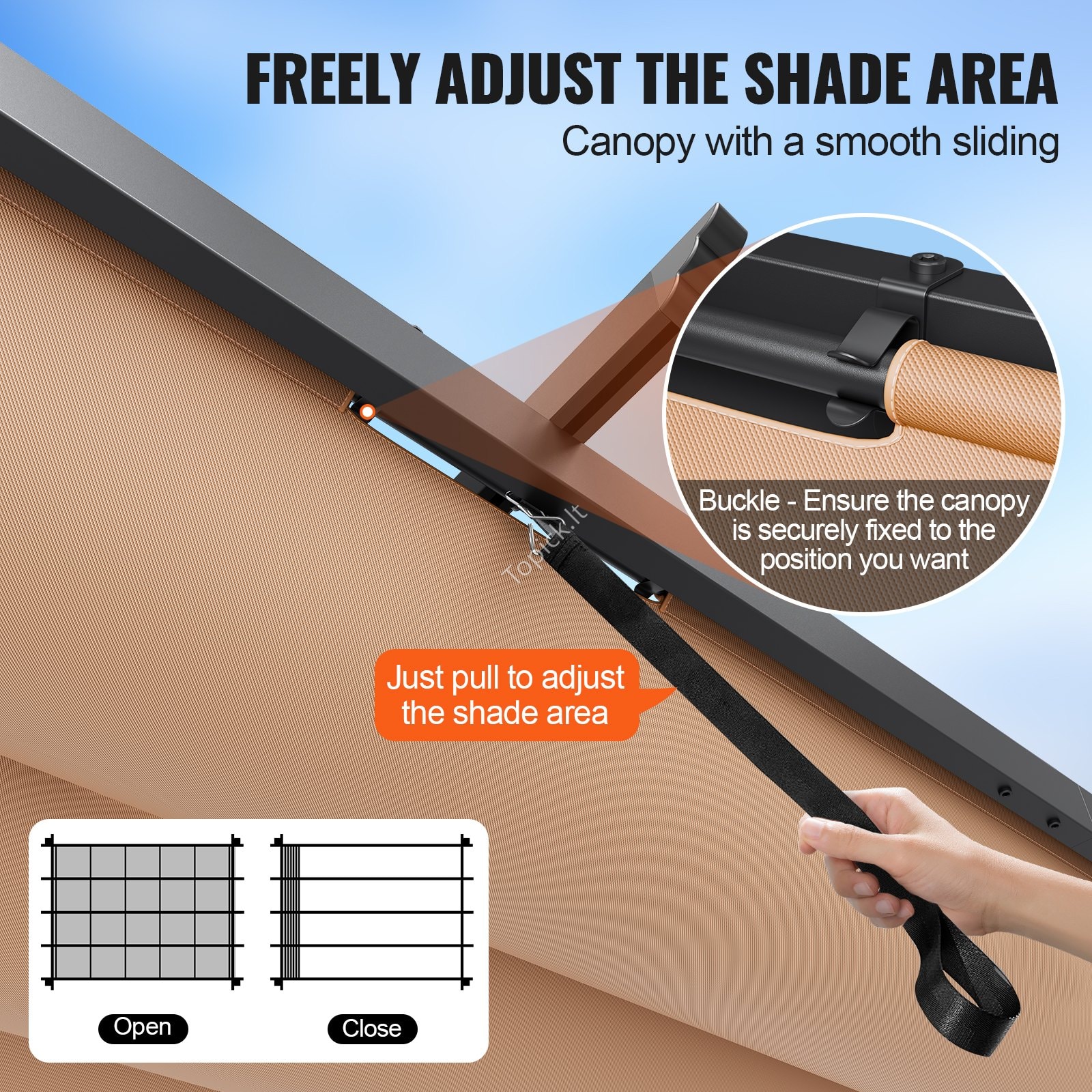 - Pavėsinė turi reguliuojamą, ištraukiamą stogelį su integruotu slydimo bėgeliu, leidžiantį lengvai reguliuoti šešėlio plotą pagal poreikį.