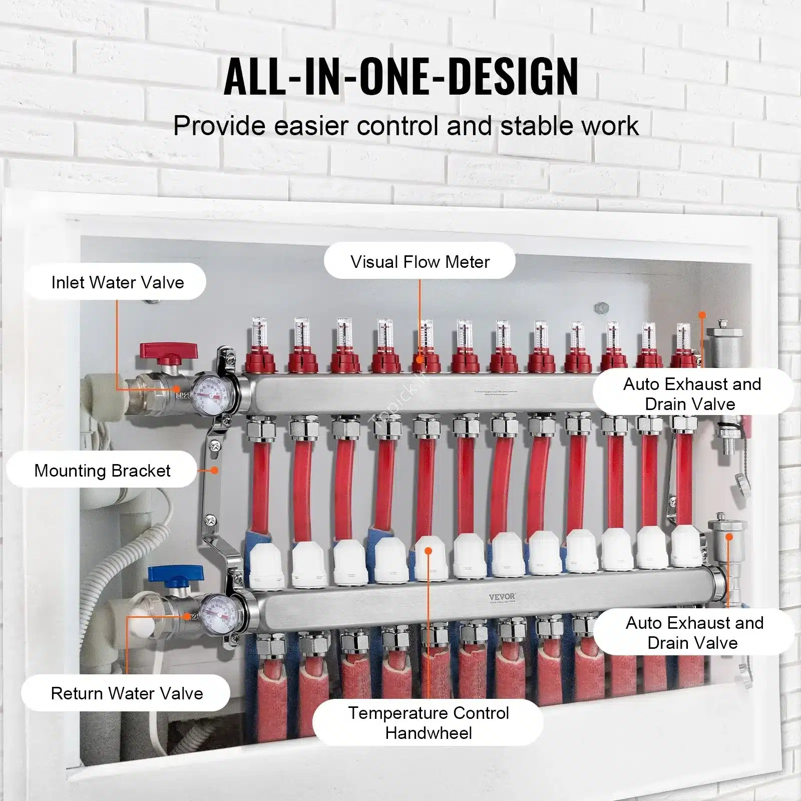 - Tikslus Hidraulinis Balansavimas: Tiekimo dalyje įmontuoti vizualiniai debitomačiai leidžia lengvai reguliuoti ir stebėti vandens srautą (nuo 0 iki 5 L/min) kiekviename kontūre. Taip lengvai subalansuosi sistemą ir išvengsi šilto/šalto grindų efekto.