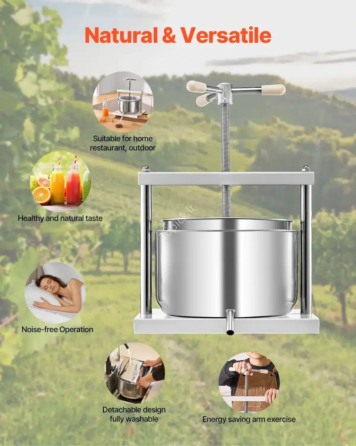 Universalus naudojimas: tinka vaisių, uogų, sultims, vynui, obuolių sidrui, alyvuogių aliejui ir kt. spausti