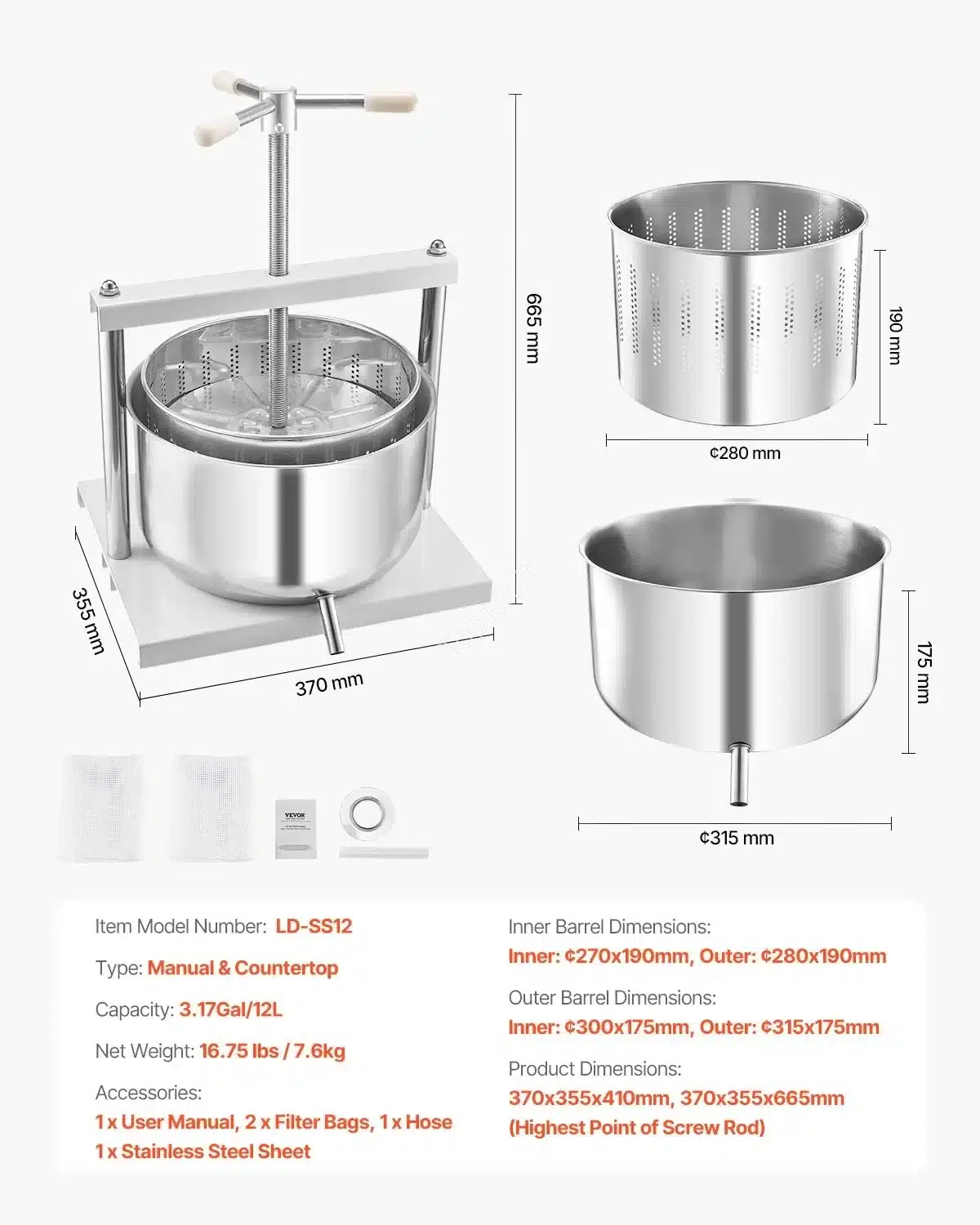 Atraskite aukščiausios kokybės 12 litrų rankinį vaisių ir vyno spaudimo presą, pagamintą iš 304 nerūdijančio plieno, užtikrinančio ilgaamžiškumą ir atsparumą rūdims. Ši presė idealiai tinka namų vyno gamybai, sultims, obuolių sidrui, uogų ir net alyvuogių aliejui spausti.