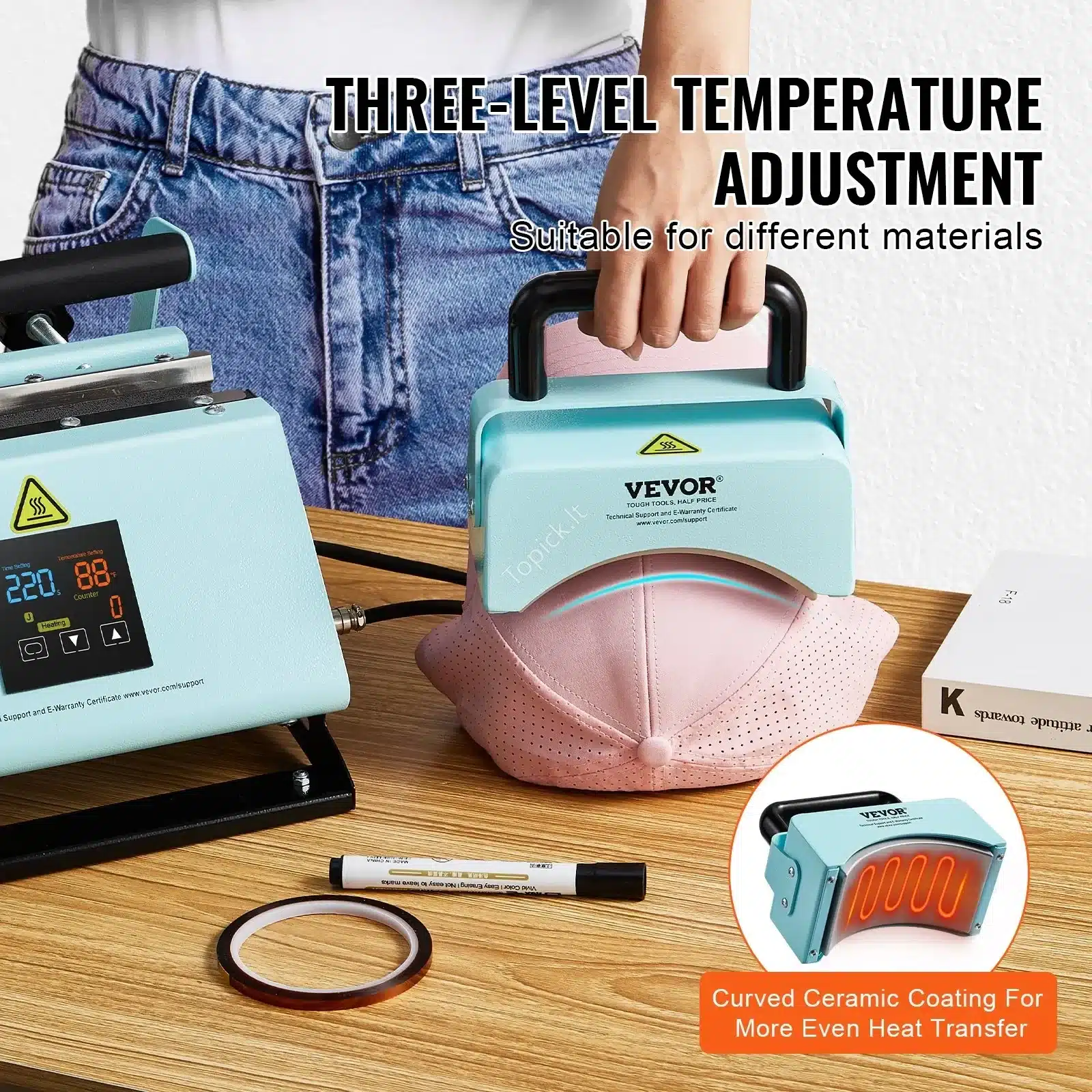 🎯 Šis įrenginys ypač tinkamas individualizuotų kepurių ir puodelių spaudimui – ergonomiškas, patogus valdymas, greita temperatūros ir laiko kontrolė, saugus naudojimas darbui tiek namuose, tiek dirbtuvėse. Produktą rasite tik Topick.