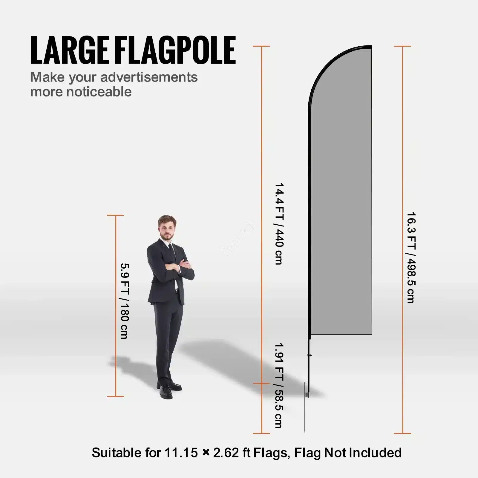 - Įspūdingas Aukštis: Kiekvieno stovo bendras aukštis, įskaitant įsmeigiamą kuolą, yra net 498.5 cm (4.985 m)! Dėl tokio aukščio tavo vėliava bus matoma iš tolo, užtikrinant maksimalų dėmesį.