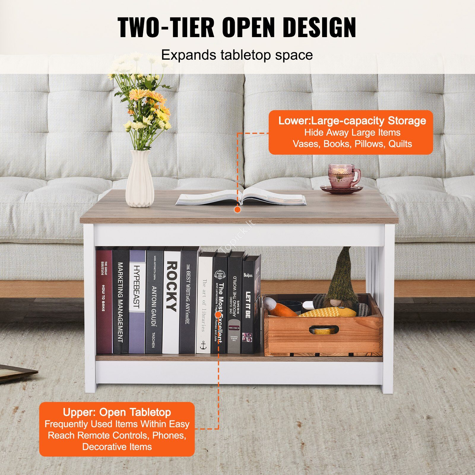 - Erdvus dizainas: kaimiško stiliaus kavos staliukas ne tik labai padidina jūsų daiktų laikymo vietą, bet ir tarnauja kaip kasdienė darbo vieta, rašomasis stalas, valgomojo stalas ir kt. Jo unikalus pusiau atviras dizainas leidžia lengvai pasiekti mažas dekoracijas, papuošalus, amatus, žurnalus ir kitus daiktus iš abiejų pusių.