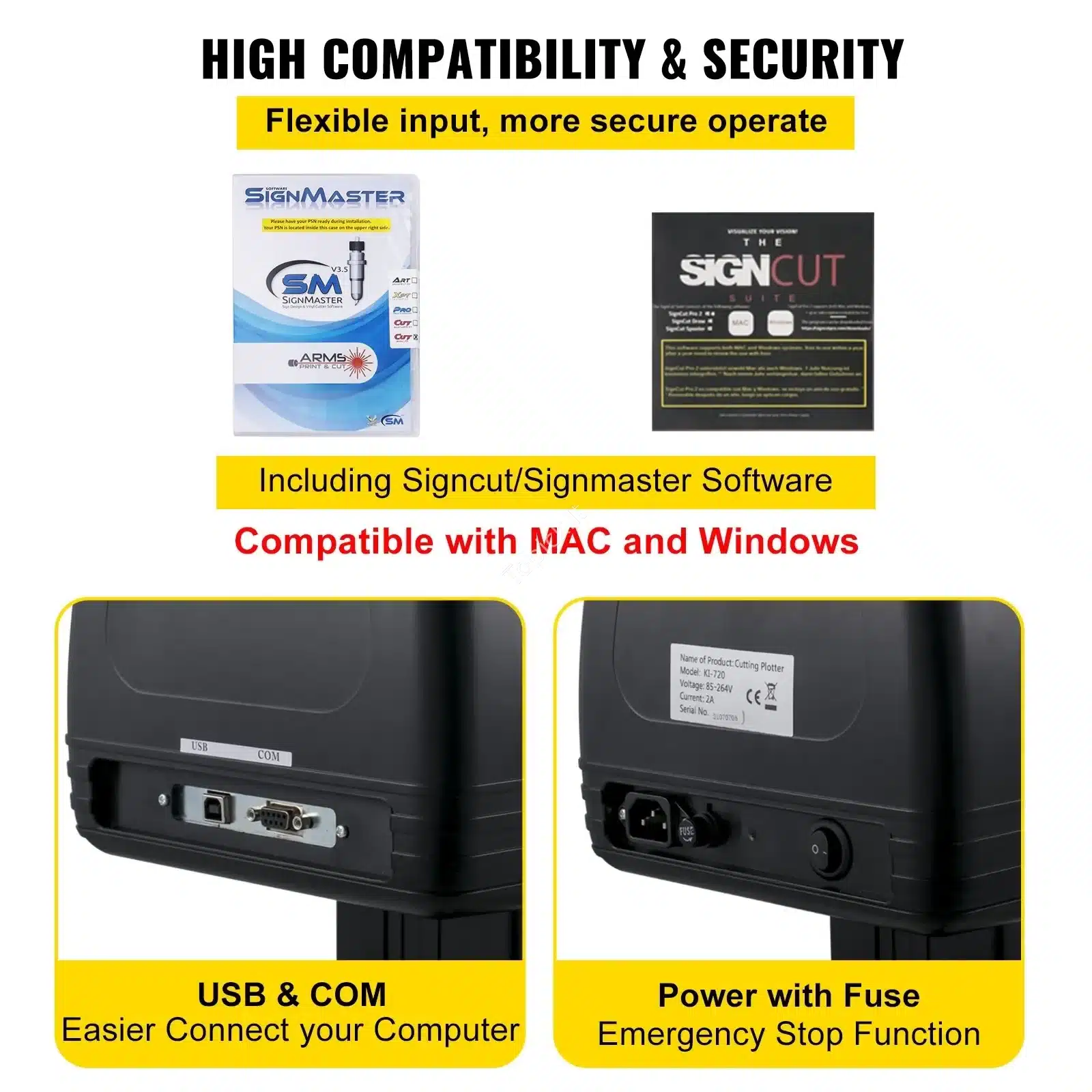 - Platus suderinamumas ir saugumas: Komplekte yra „SignCut“ ir „SignMaster“ programinė įranga, suderinama su „Mac“ ir „Windows“ operacinėmis sistemomis per USB arba nuosekliąją sąsają. Taip pat palaiko kitas programas, tokias kaip „Graph-Cut“ ir „Flexi“. Turi saugiklį ir avarinio stabdymo funkciją, užtikrinančius saugumą.