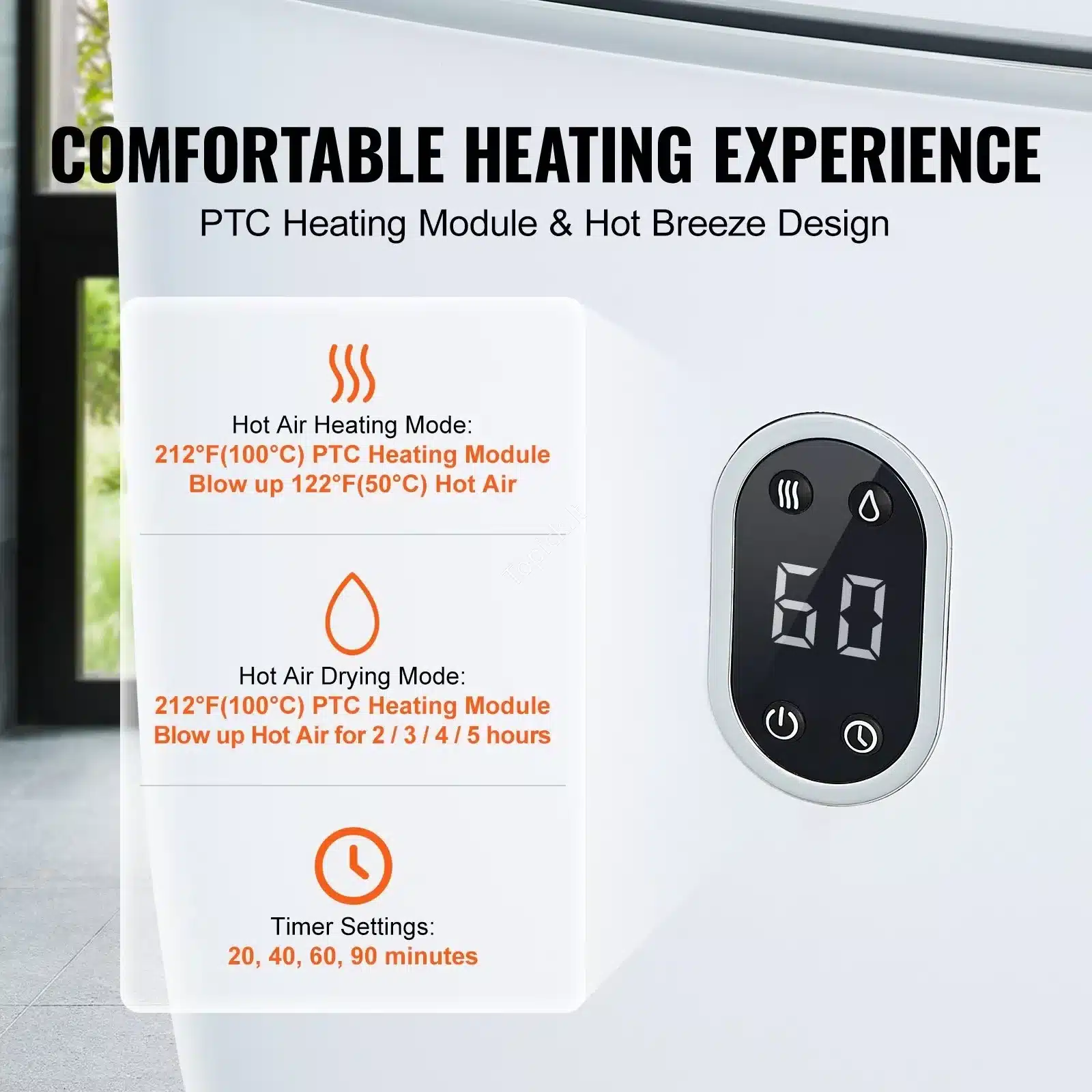 Šildytuvas pasižymi inovatyvia penkių pusių šildymo sistema, užtikrinančia, kad rankšluosčiai įšiltų tolygiai ir greitai. Jums nebereikės laukti! ✨ Patogus LED ekranas leidžia lengvai stebėti ir valdyti nustatymus, o integruotas laikmatis siūlo 4 šildymo (20/30/60/90 min.) ir 4 džiovinimo (2/3/4/5 val.) režimus.