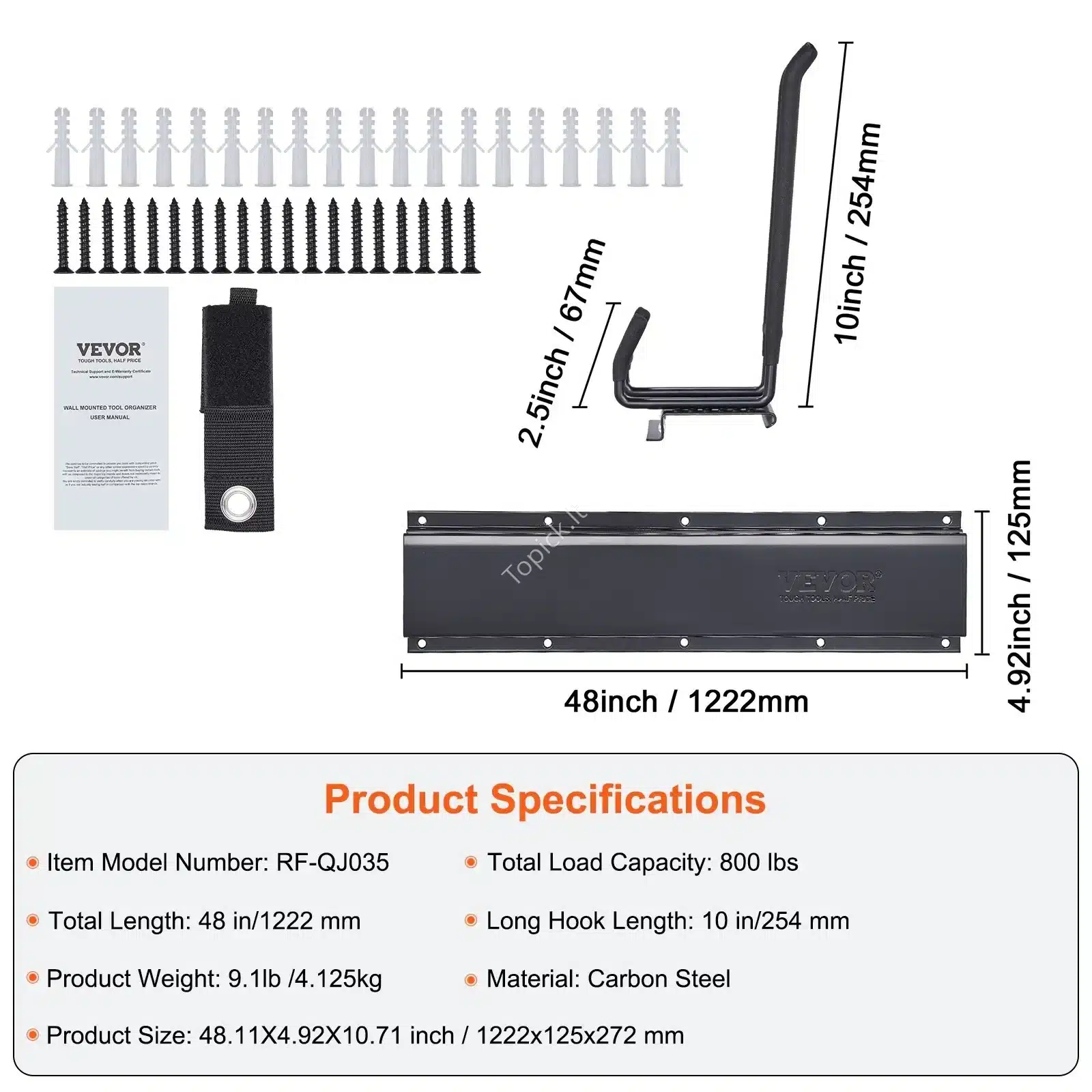 Sieninis Garažo Įrankių Organizatorius – 1222x125x272 mm, Anglies Plieno, 363 kg Apkrova, su 6 Reguliuojamais Kabliais