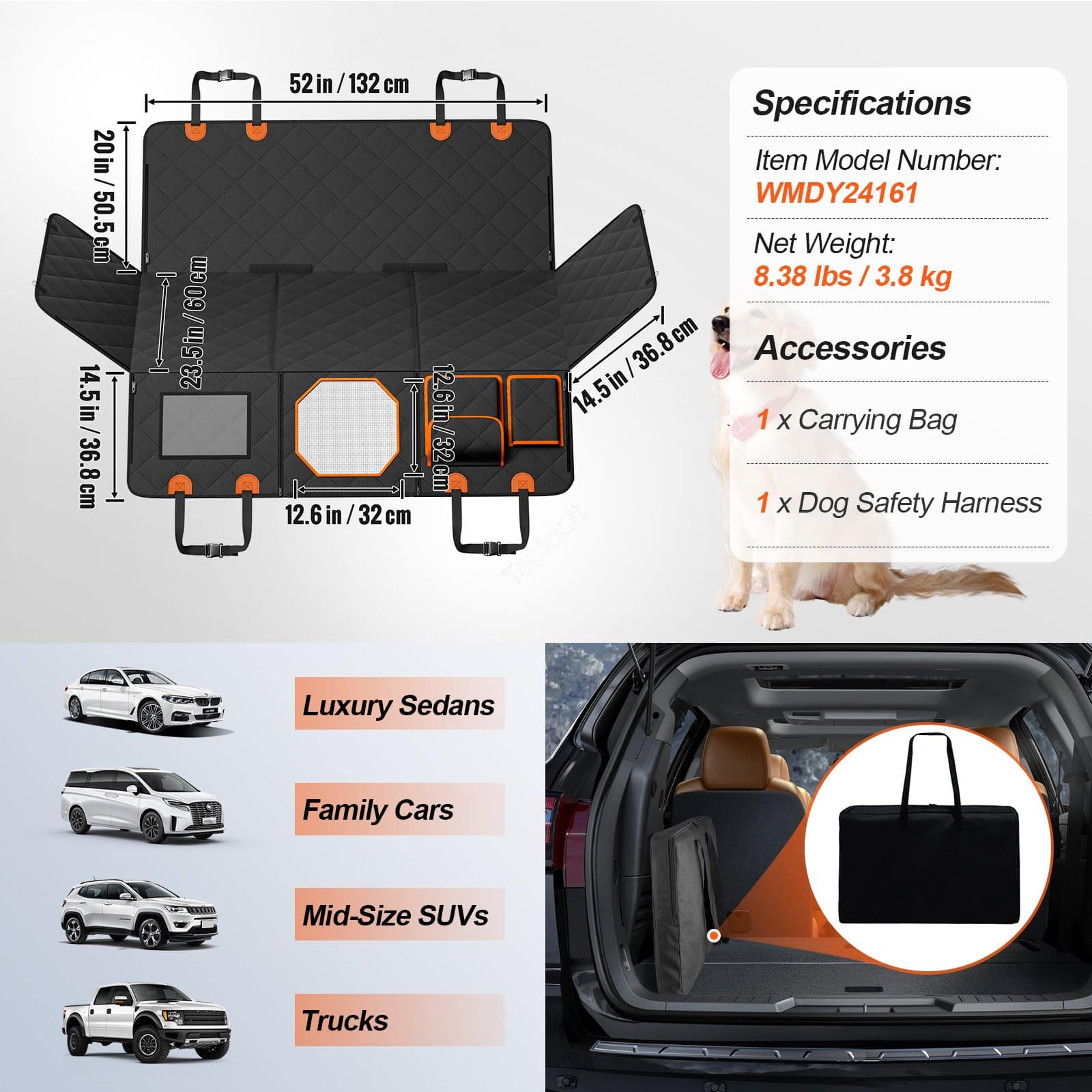 - Erdvi erdvė: Ar turite mažai vietos galinėje sėdynėje savo šuniui? Šis automobilio sėdynės užvalkalas yra pagamintas iš tvirtos lentos, kuri pailgina galinę sėdynę 40%, suteikiant jūsų augintiniui daugiau vietos patogiam pasivažinėjimui.