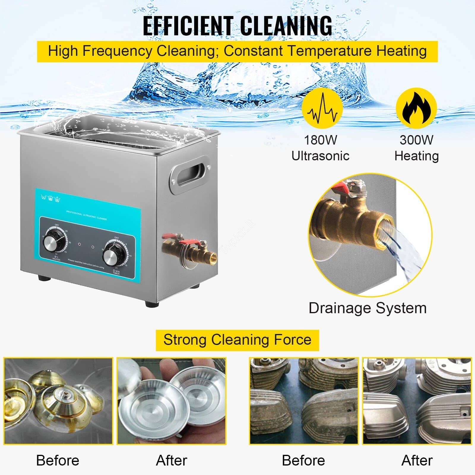 - 【PREMIUM MEDŽIAGA】 – Ultragarso galia: 180 W; Dažnis: 40 kHz; Šildymo galia: 300 W; 304 nerūdijančio plieno bakas, apsauga nuo korozijos įvairiems sprendimams. Apsauga nuo rūdžių su ilgesniu veikimo laiku. Puikus produktas, skirtas išvalyti daiktus ir atsikratyti sunkių rankų darbo.