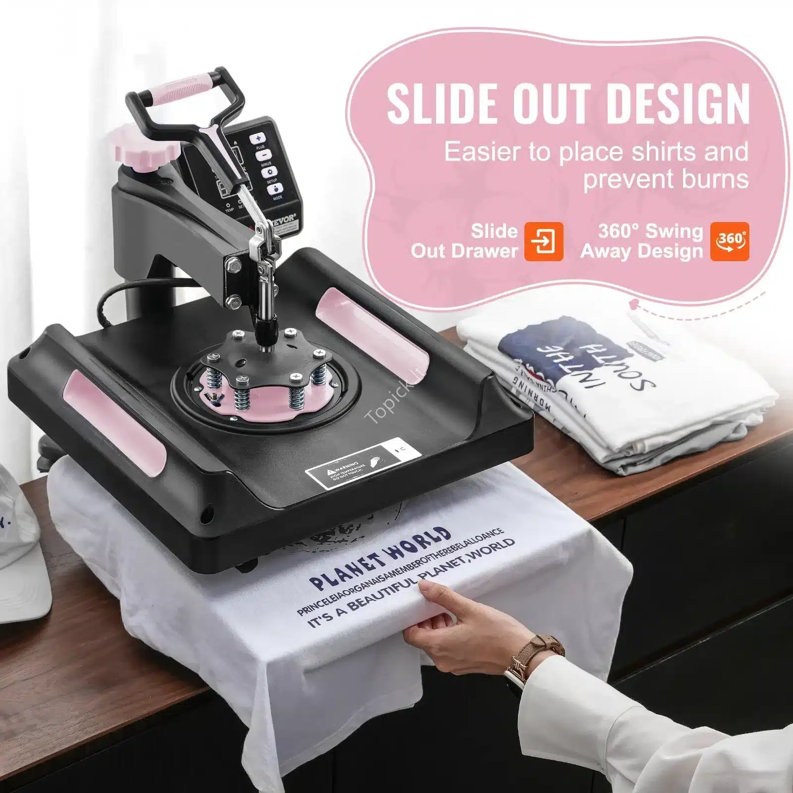 - Patogumas ir saugumas: Dėl 360° kampu besisukančios rankenos ir ištraukiamo preso pagrindo, galėsite saugiai ir patogiai dirbti, išvengdami kontakto su įkaitusia plokšte. Plokštė padengta nelimpančia danga, kad būtų lengva valyti ir apsisaugotų nuo pridegimo. 🛡️