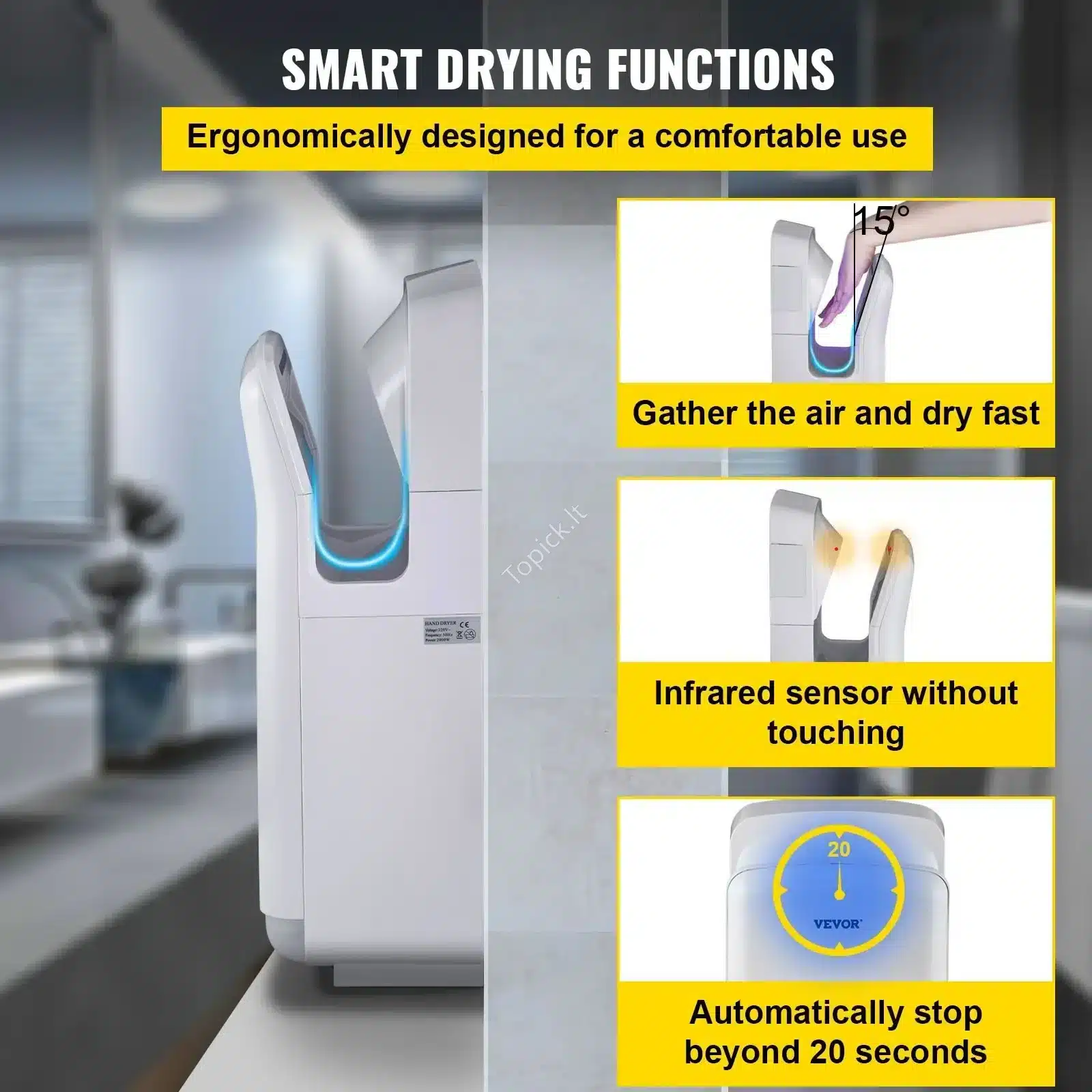 - Bekontaktis Valdymas: Abu šonai turi infraraudonųjų spindulių jutiklius – džiovintuvas įsijungia automatiškai įkišus rankas ir išsijungia jas ištraukus (maksimaliai higienai).