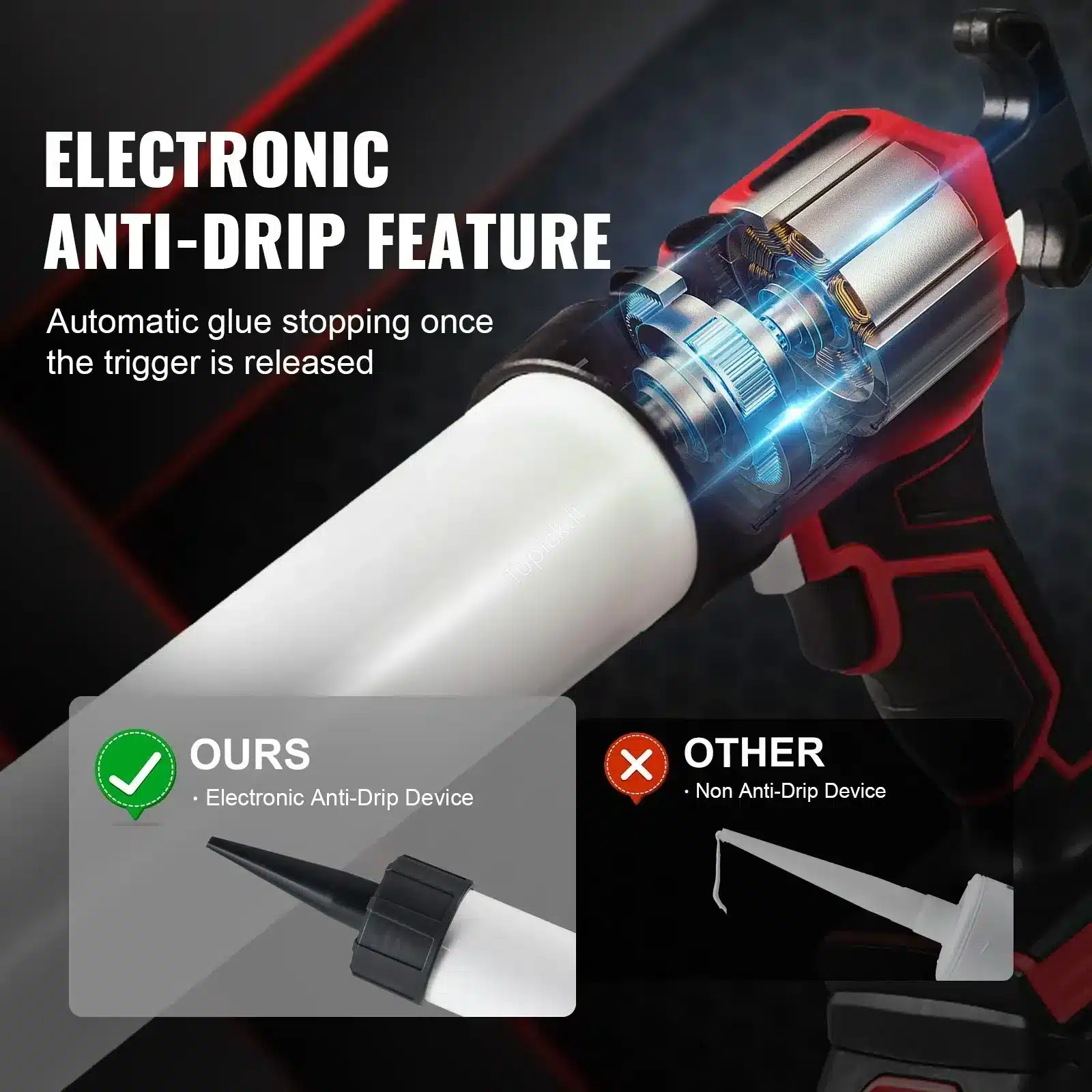 - Jokio Lašėjimo: Elektroninė anti-lašėjimo funkcija automatiškai atleidžia slėgį baigus darbą, tad nebus jokių netvarkingų lašų ir sutaupysi brangaus hermetiko.