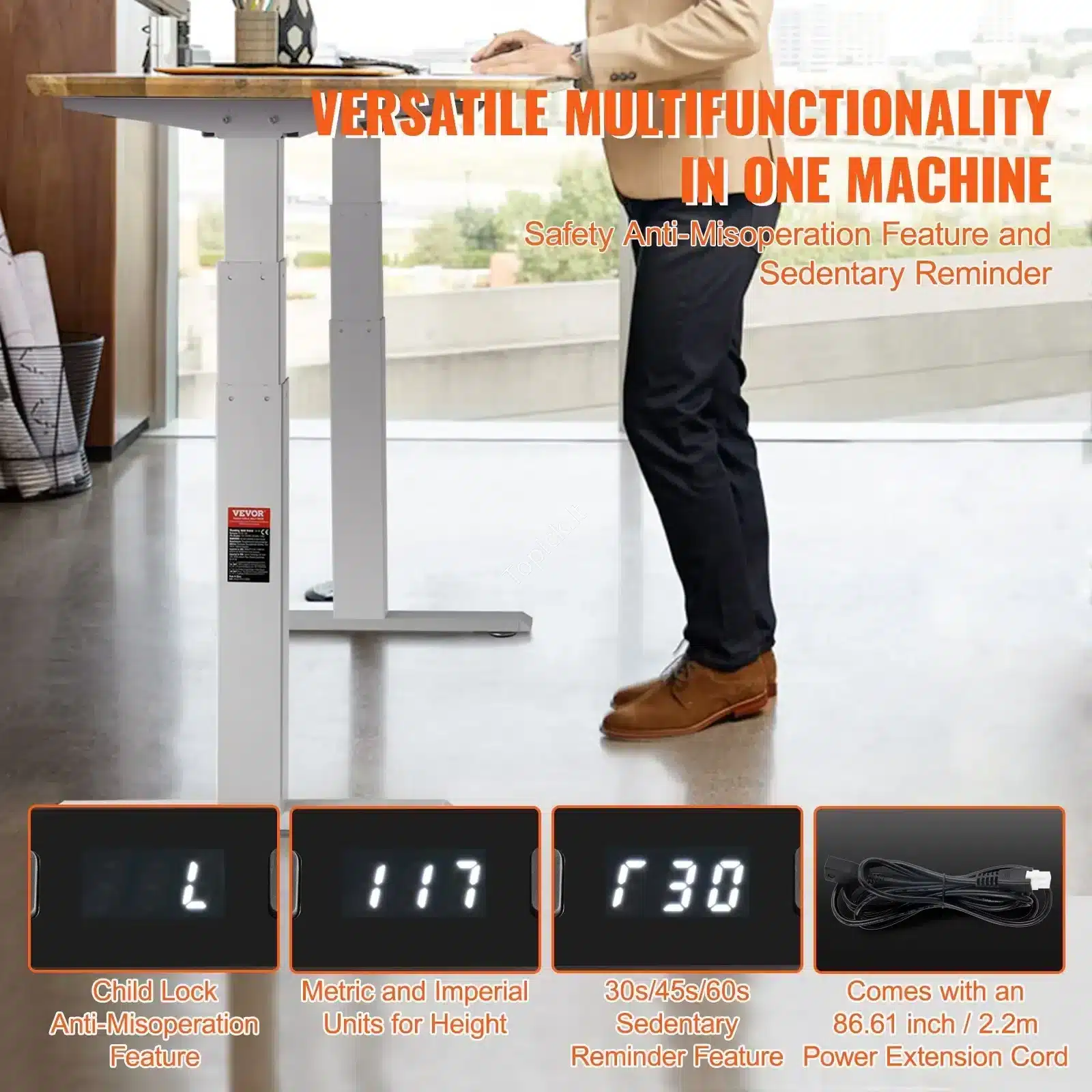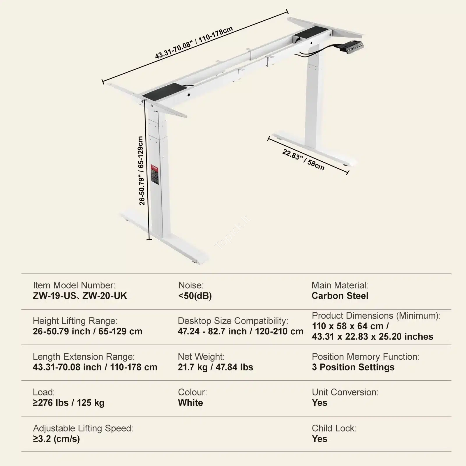 Aukščiausios Klasės Elektrinis Stalo Rėmas, Baltas, Dviejų Variklių, 3 Segmentų Kojos, Reguliuojamas Aukštis 65-129 cm ir Plotis 110-178 cm, 125 kg