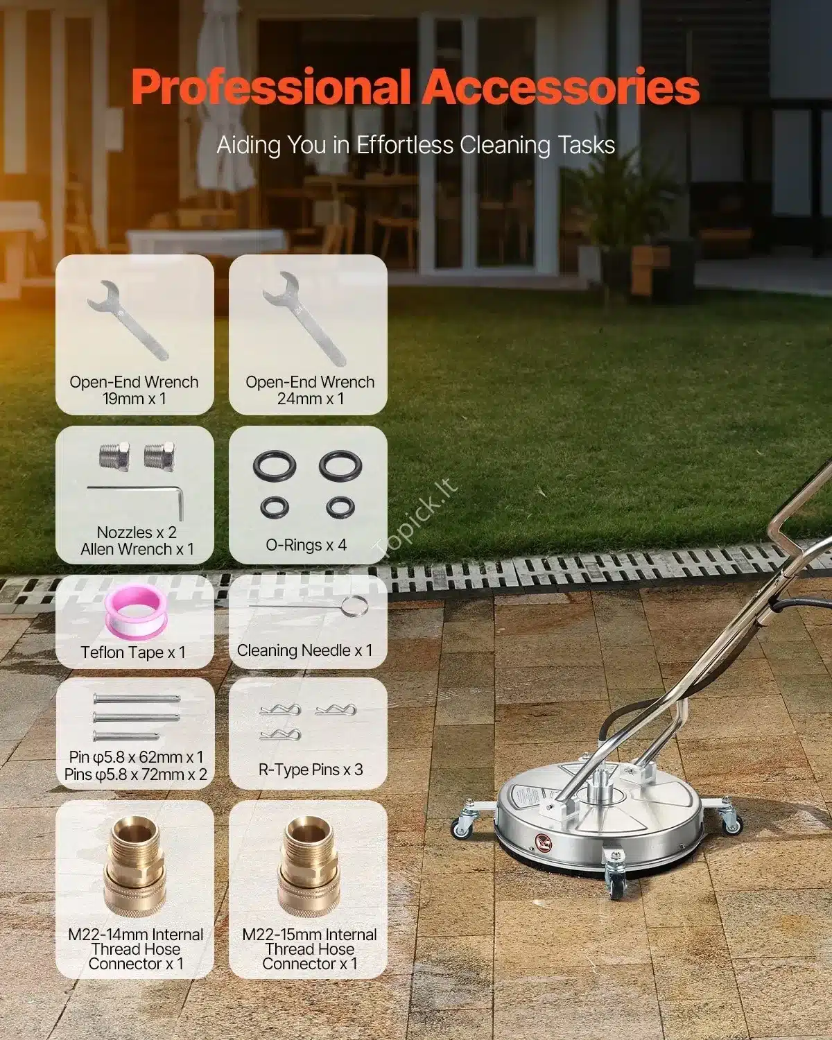 Šis aukšto slėgio paviršiaus valiklis yra nepakeičiamas įrankis kiekvienam, norinčiam sutaupyti laiko ir pastangų tvarkant lauko erdves. ✨