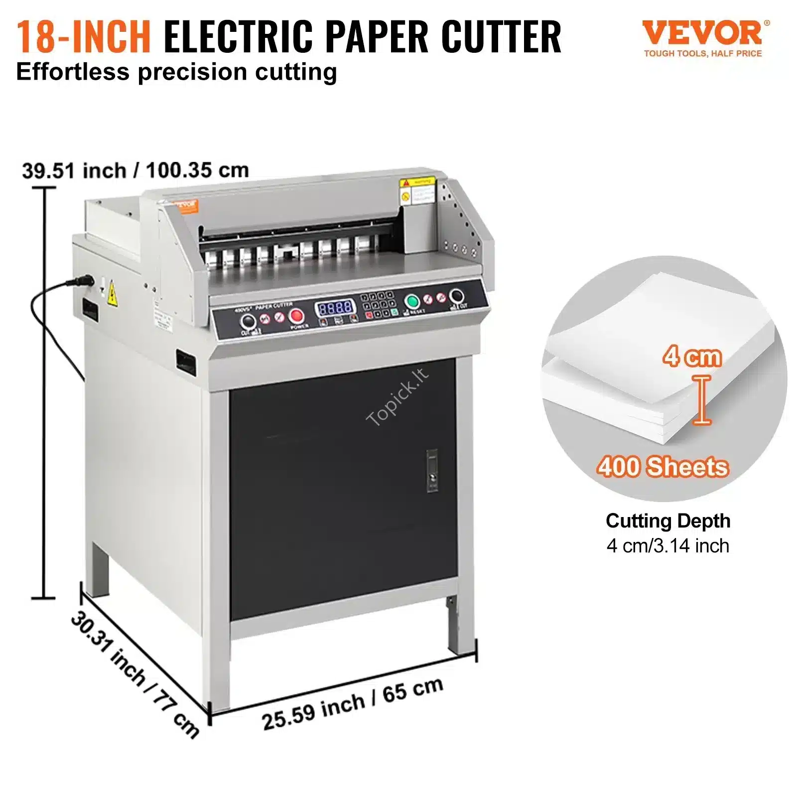 Reikia tikslumo ir greičio pjaunant dideles popieriaus krūvas? Ši automatinė, elektrinė giljotina su 450 mm (18”) pjovimo pločiu ir galimybe pjauti iki 40 mm aukščio paketą yra idealus pagalbininkas tavo biure ar mažoje spaustuvėje! Valdymas yra skaitmeninis ir itin patogus, o saugumas – aukščiausio lygio.