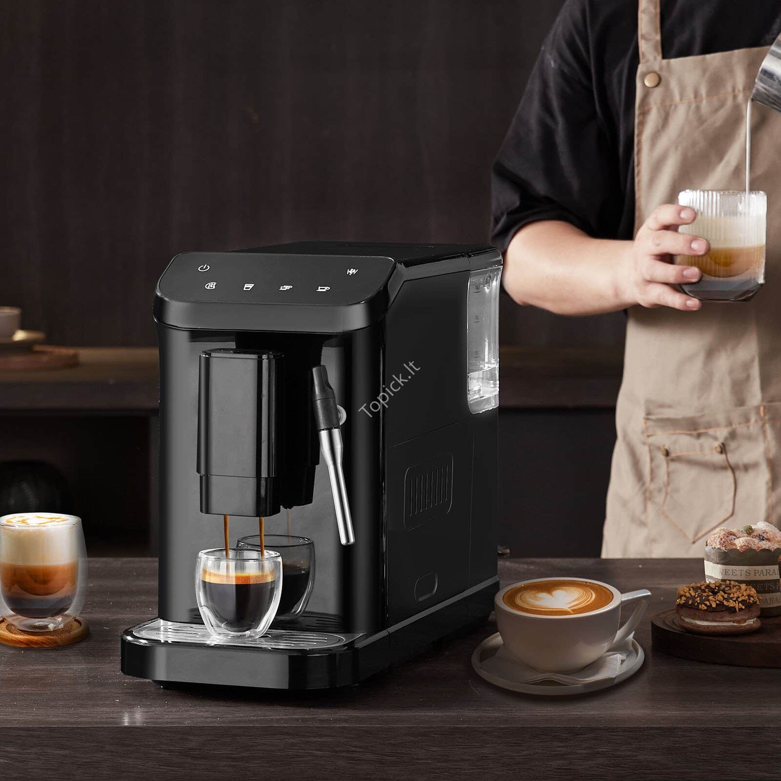 - Lengvas prisilietimas norint pradėti: daugiafunkcinis ir jautrus jutiklinis ekranas leidžia pasirinkti ir nustatyti funkcijas kaip vaikišką žaidimą. Lengvu prisilietimu gausite vieną / dvigubą espreso kavą, amerikietišką kavą ir prieigą prie kitų funkcijų.