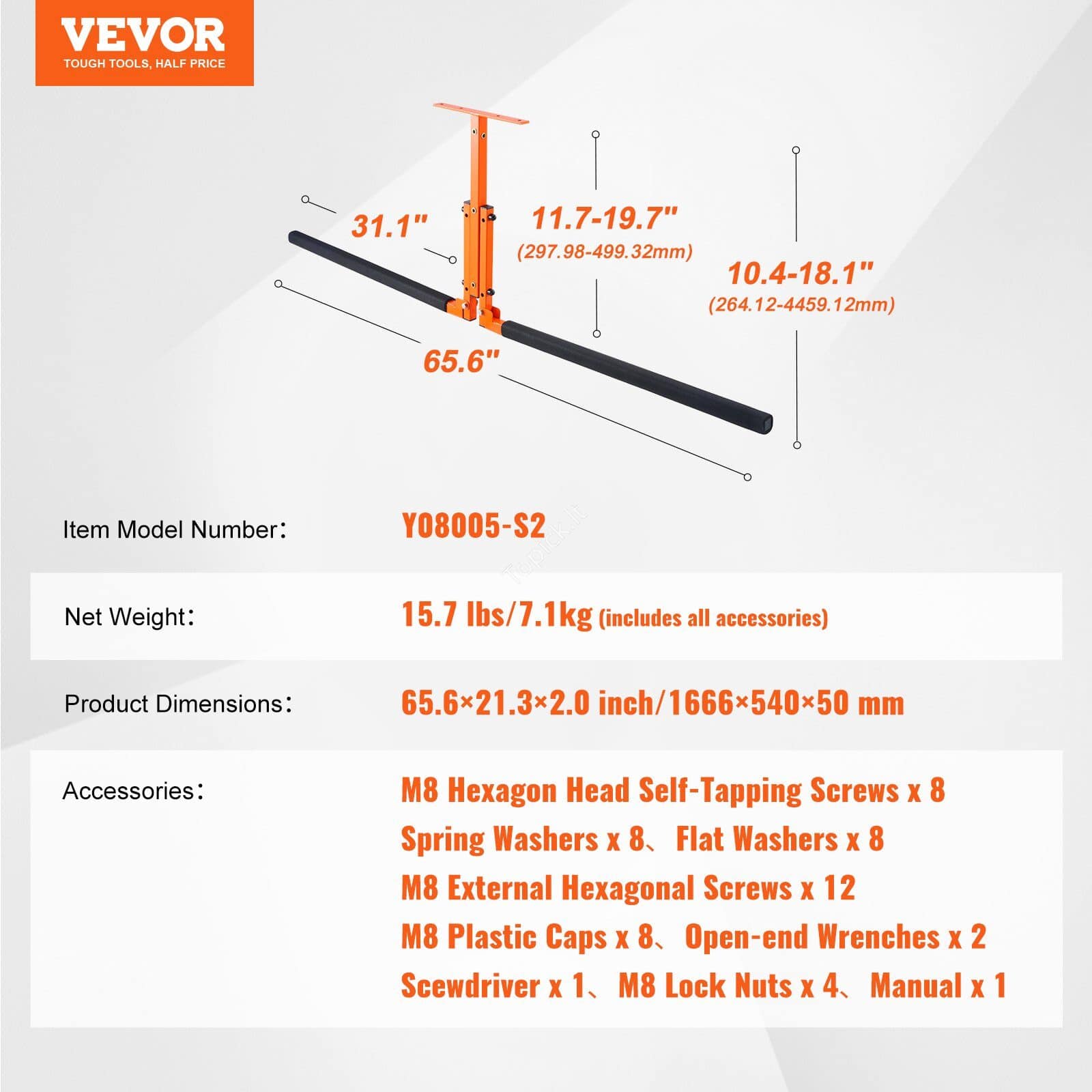 • Reguliuojamas aukštis: Stabilūs laikikliai su 790 mm ilgio atraminiais rankenėliais ir 200 mm atstumu tarp tvirtinimo angų leidžia pritaikyti aukštį nuo 22,07 iki 50,04 cm.
