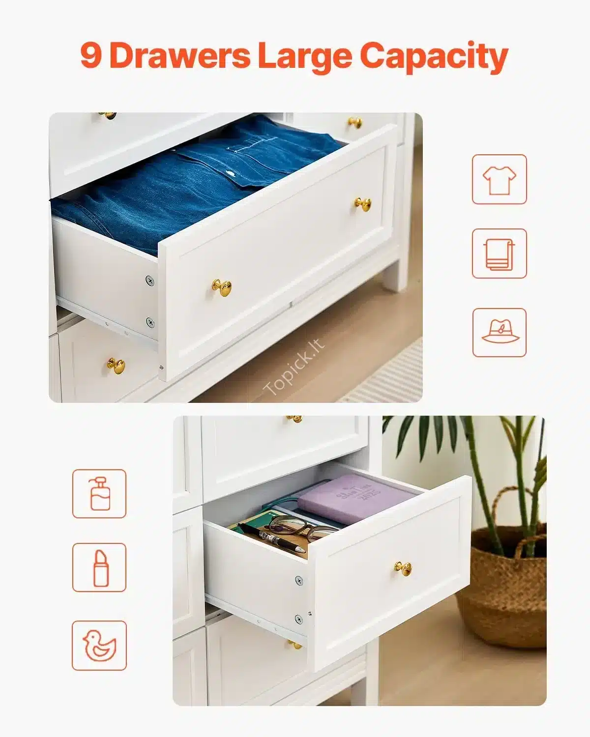- Neribota Talpa: Net 9 stalčiai (3 dideli apačioje ir 6 mažesni viršuje) leidžia puikiai suskirstyti daiktus: nuo didesnių megztinių ir rankšluosčių iki smulkių aksesuarų ar dokumentų. Pagaliau viskas turės savo vietą!