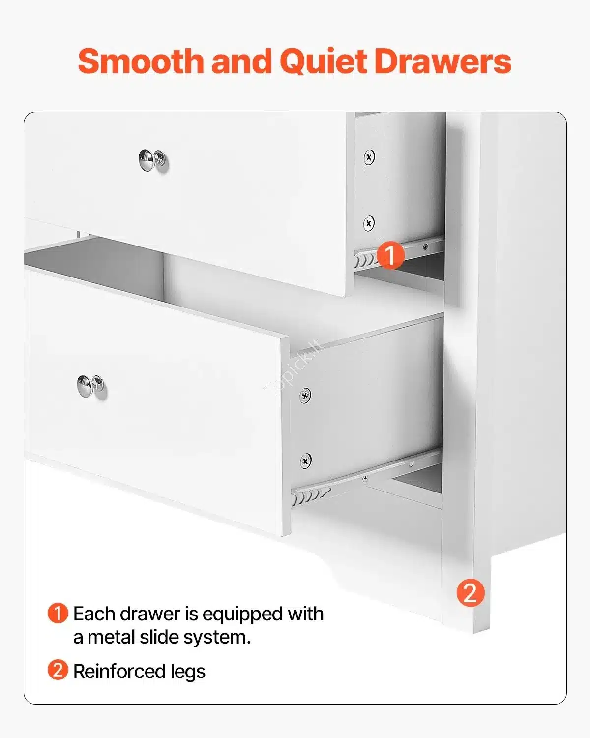 - Ilgaamžiškumas: Pagaminta iš kokybiškos medžio drožlių plokštės (MDP), MDF ir PVC, komoda yra tvirta ir atlaiko kasdienį naudojimą. Ant viršaus drąsiai statyk vazas ar knygas – viršus atlaiko 45 kg!