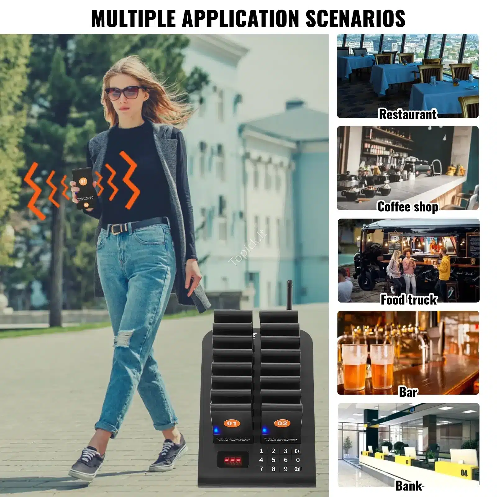 Leiskite savo svečiams laukti patogiai ir be streso! Šis belaidis restorano kvietimų signalas leidžia greitai informuoti klientus apie jų eilę. Klientų kvietimo įrenginiai reaguoja vibracija ir mirksėjimu, todėl jūsų svečiai niekada nepraleis savo eilės.