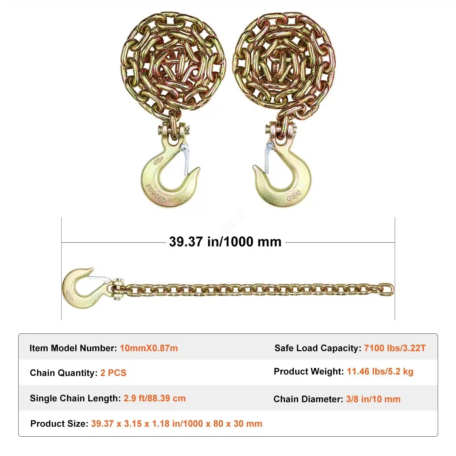 🔗 Komplektas iš dviejų aukštos kokybės G80 klasės tempimo grandinių – skirtas profesionaliam krovinių, technikos ar medienos tvirtinimui bei tempimui.