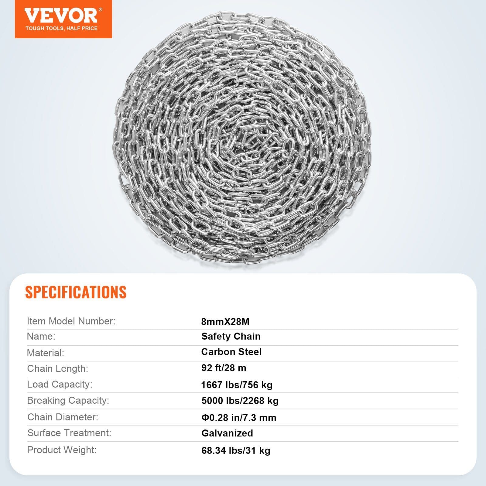 ⛓️ Plieninė Grandinė 28 m x 7,3 mm | Cinkuota Anglinio Plieno Grandinė Tvirtinimui, Žymėjimui, Apsaugai ir Atitvėrimui