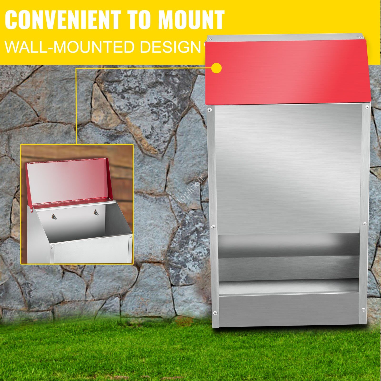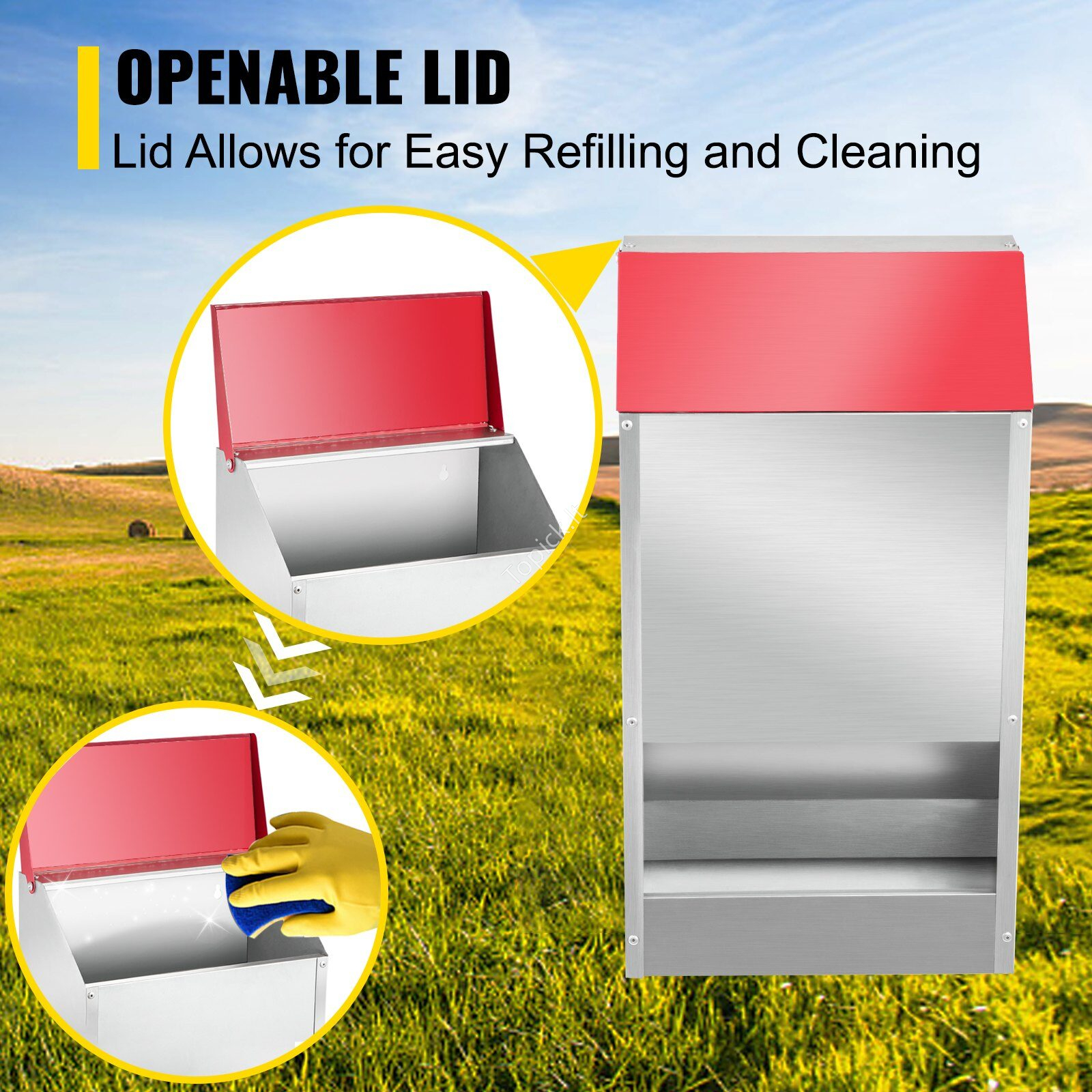 - 【Cinkuota PLIENO KONSTRUKCIJA】 – Mūsų vištidės šėrykla yra pagaminta iš cinkuoto plieno, kuris yra atsparus vandeniui ir patvarus esant lauko orams, nesvarbu, ar tai yra kaitri saulė, nedidelis lietus ar sninga. Nereikia jaudintis, kad ši vištidės lesyklėlė surūdys ir subyrės po ilgo naudojimo lauke.