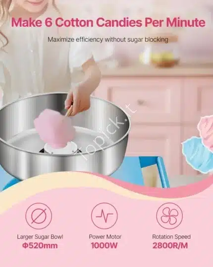 - Dirbkite su bet kokiais jums patinkančiais saldainiais: Naudodami šį cukraus vatos aparatą galite pasigaminti skanių cukraus vatos iš įprastų cukraus vatos, pieno cukraus, vaisių kubelių ar mėgstamų saldainių. Dėl savo kompaktiško dydžio jis tinka ant bet kokio darbo paviršiaus ir puikiai tinka karnavalams, festivaliams, gimtadieniams ir sporto renginiams.