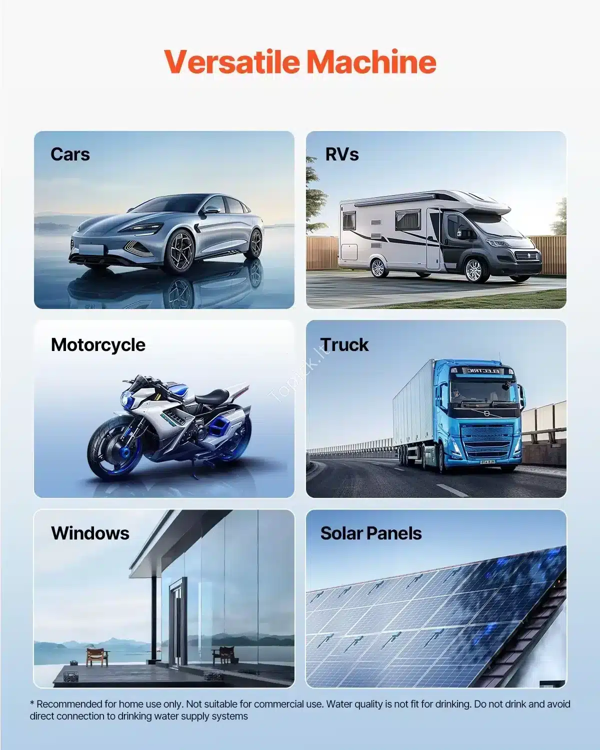 - Universalus Naudojimas: Tinka plauti ne tik automobilius, bet ir namelius ant ratų (RV), motociklus, valtis, langus bei saulės baterijų plokštes.