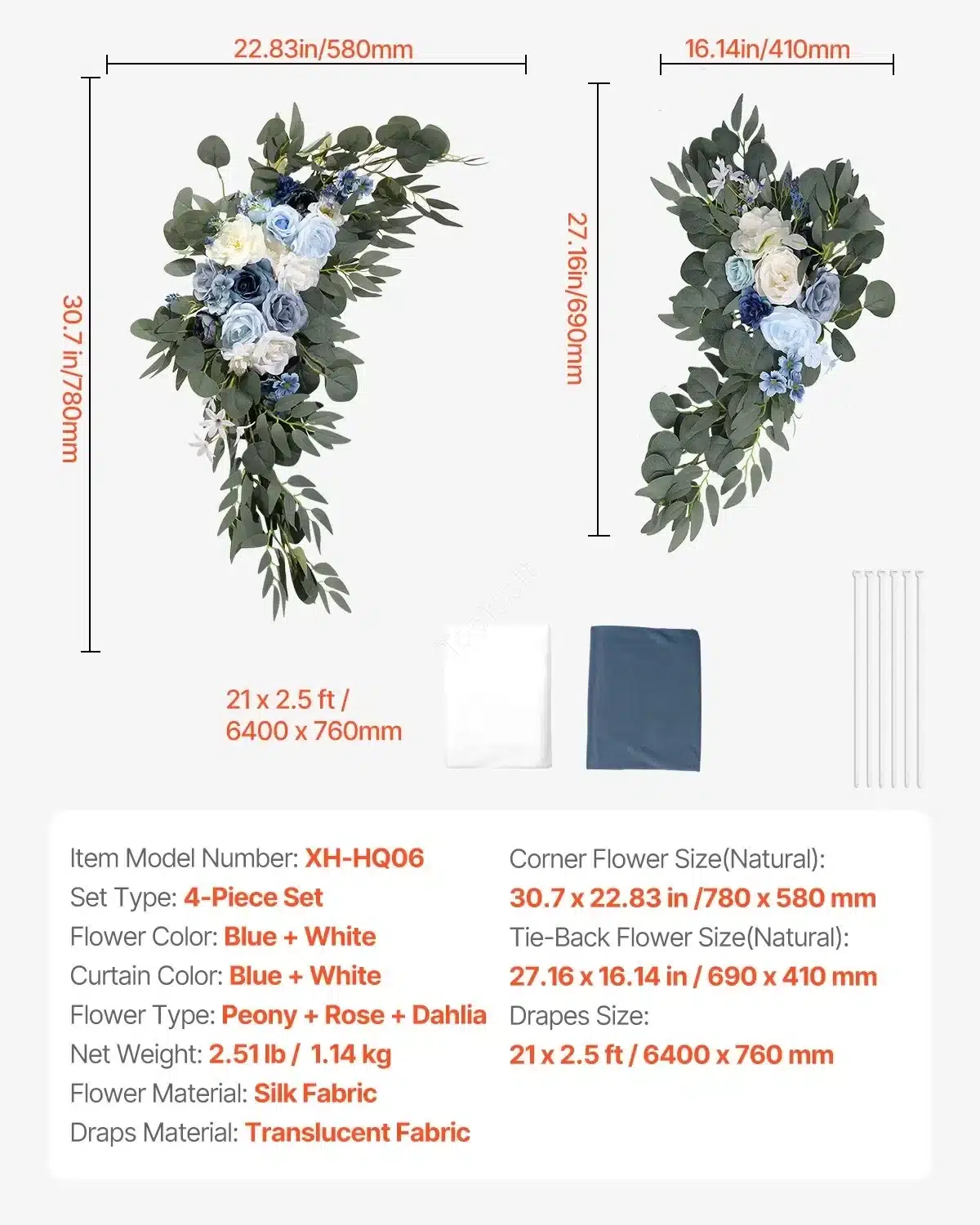 Dirbtinis vestuvių arkos komplektas su gėlėmis ir užuolaidomis – mėlyna