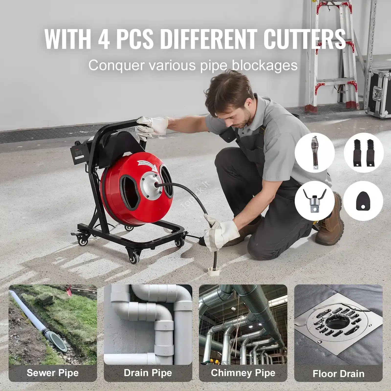 🛠️ Kanalizacijos valymo mašina su ratais ir rankine įvorka | 15 m x 12,7 mm plieninė spiralinė viela | Profesionalus vamzdžių valiklis su mobilumu