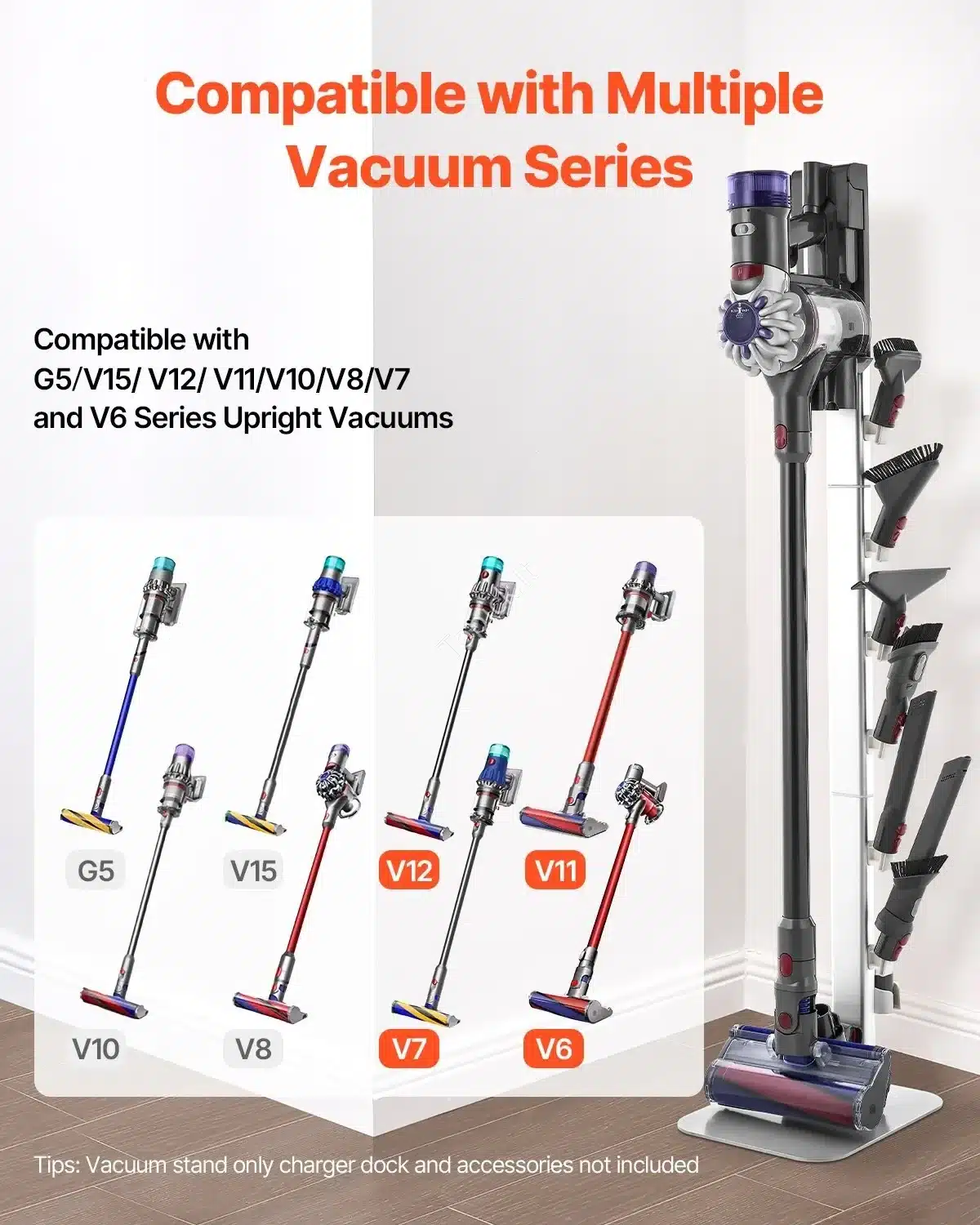 Stovas sukurtas taip, kad tiktų daugeliui populiarių modelių, įskaitant „Dyson“ V6, V7, V8, V10, V11, V15 serijas. Su patikimu pagrindu ir 6 laikikliais priedams, visi jūsų įrankiai bus tvarkingai ir lengvai pasiekiami. Patvarus plienas užtikrina ilgalaikį stovas stabilumą ir tvirtumą. Minimalistinis dizainas su sidabro spalvos apdaila puikiai įsilieja į bet kokį interjerą, o namai atrodo švarūs ir organizuoti.