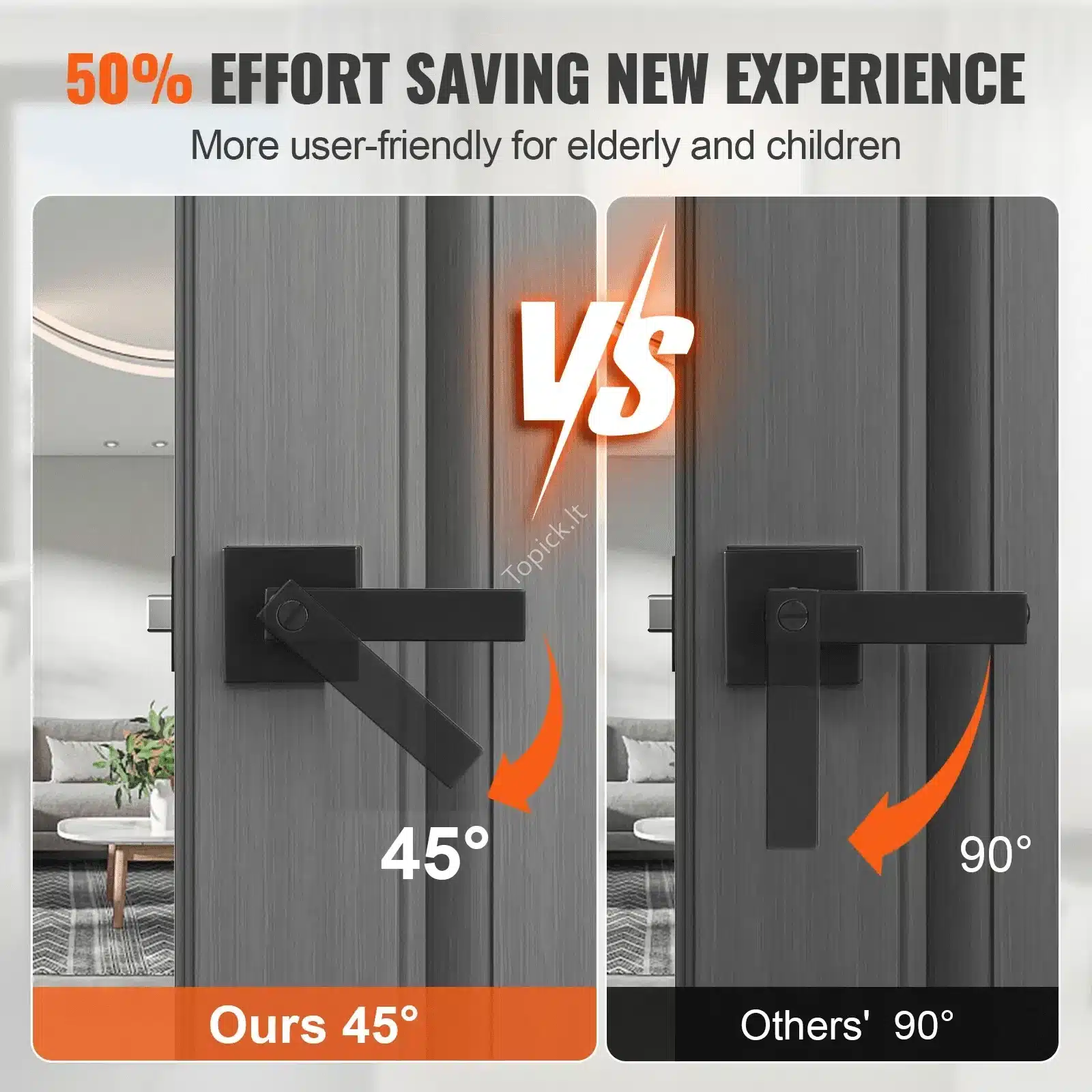 - Patogumas: Pasukimas 45° kampu leidžia lengvai atidaryti duris, reikalaujant mažiau pastangų nei tradicinės rankenos.