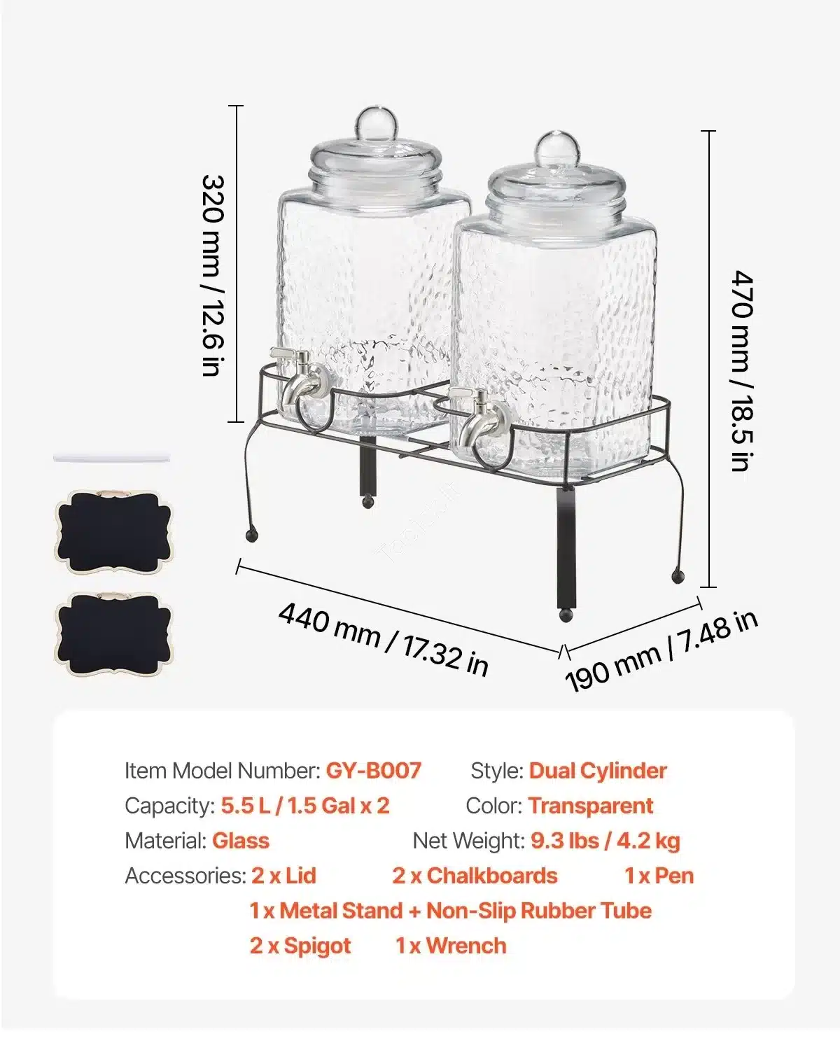 Dviejų skyrių gėrimų dozatorius 2×5,5 l | Stiklinis sulčių ir gaiviųjų gėrimų dispenseris su čiaupu