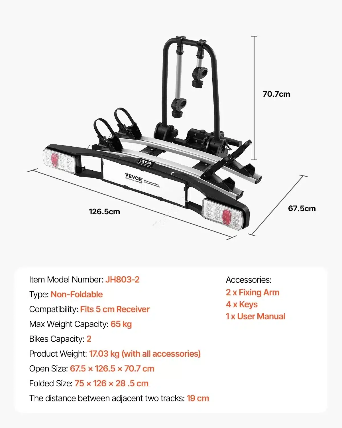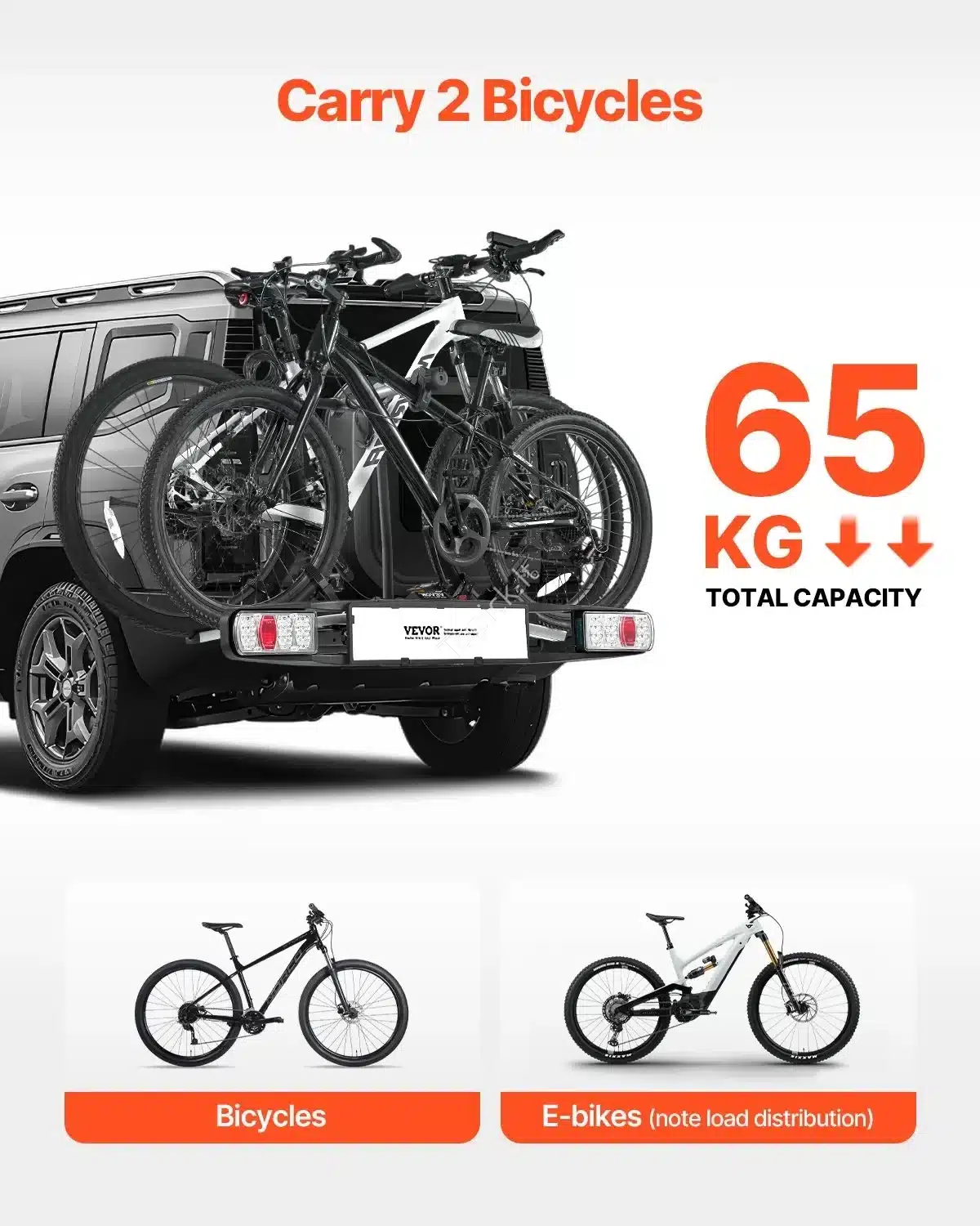 - Keliamoji galia: Atlaiko svorį iki 65 kg ir skirtas vežti iki 2 dviračių.