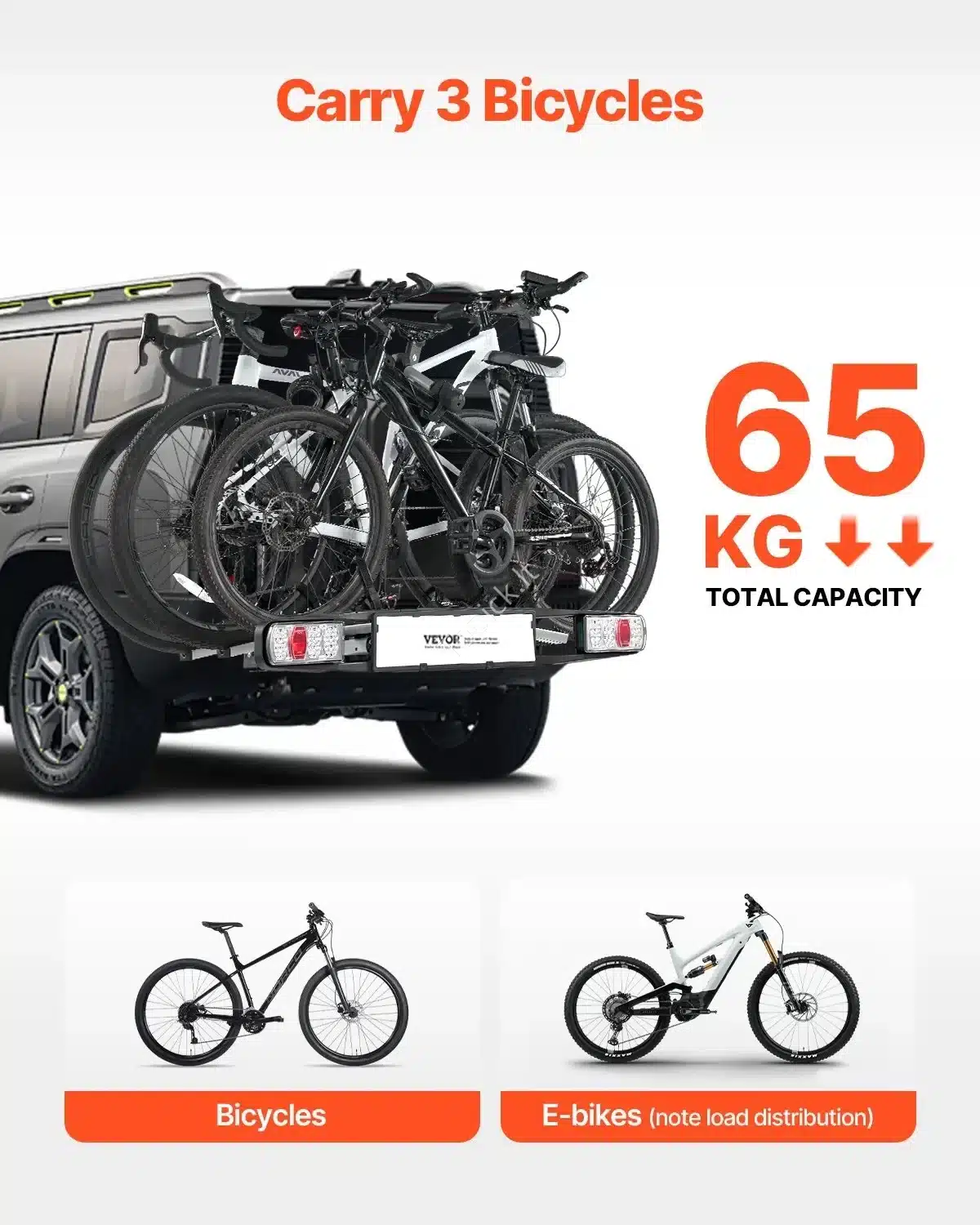 - Keliamoji galia: Atlaiko svorį iki 65 kg ir skirtas vežti iki 3 dviračių.