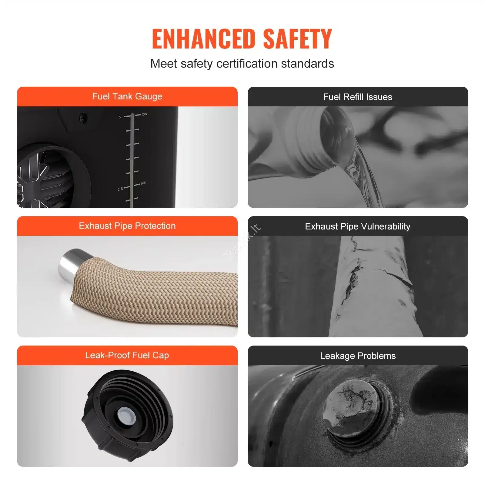 - Saugumas: Integruota CO signalizacija, apsauga nuo perkaitimo ir kuro lygio indikatorius.
