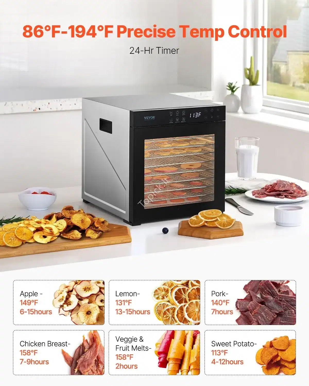 - Didelė talpa: 10 erdvių nerūdijančio plieno padėklų (kiekvienas 28.5 x 30.5 cm) suteikia daug vietos vienu metu džiovinti įvairius produktus. Bendras tūris – 25 L.
