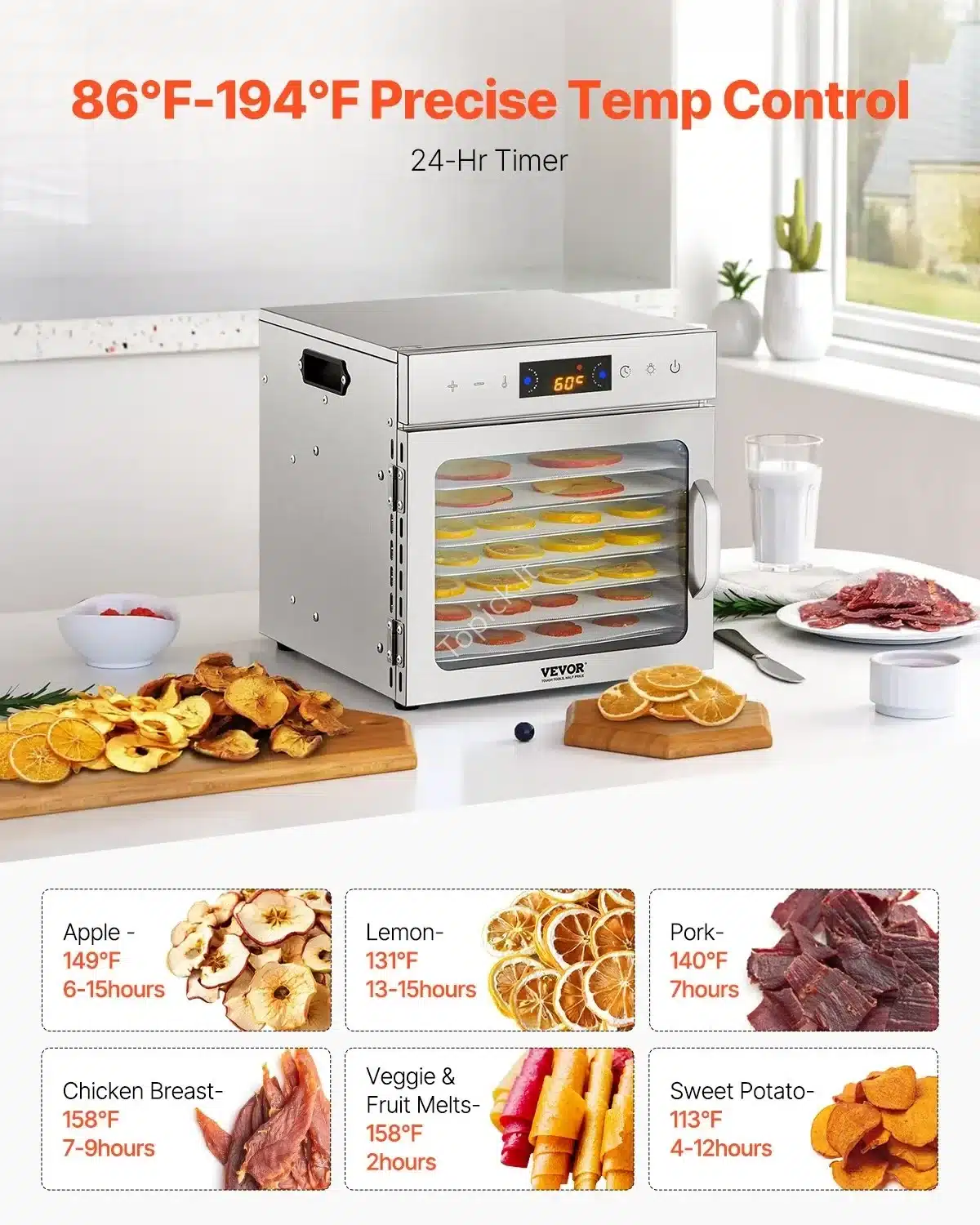 Ieškote patikimos džiovyklės vaisiams, daržovėms, grybams ar mėsai? Ši maisto džiovyklė su 8 nerūdijančio plieno padėklais leis mėgautis sveikais užkandžiais ištisus metus, išsaugant visas maistingąsias medžiagas ir vitaminus. Puikiai tinka namams, kavinėms ar restoranams. 🥕