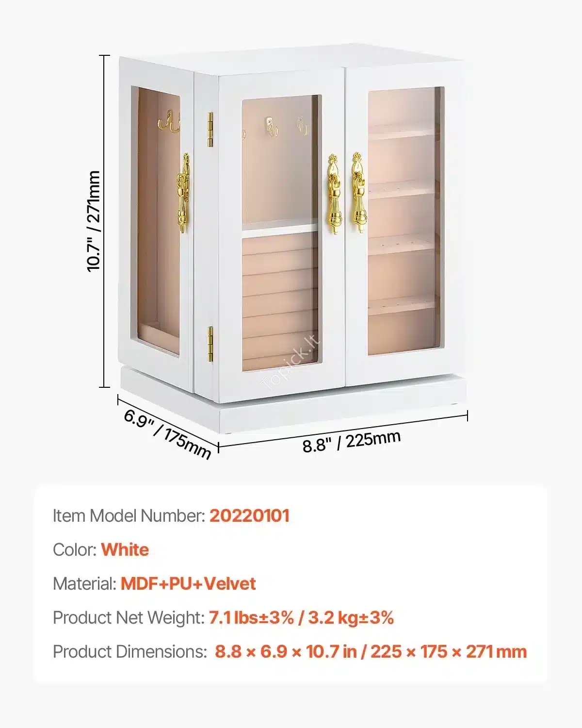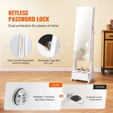 - Aukštos Kokybės Apdaila: Tvirta MDF konstrukcija, elegantiška PU danga ir minkštas aksomo pamušalas užtikrina ne tik stilingą išvaizdą, bet ir apsaugo tavo brangius papuošalus nuo įbrėžimų.