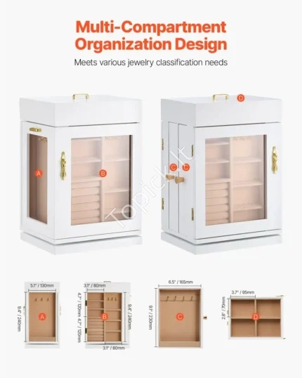 Ši elegantiška, 360° kampu sukama juvelyro dėžutė yra stilingas ir funkcionalus sprendimas tavo papuošalų kolekcijos tvarkymui. Balta spalva ir skaidrūs akrilo šonai suteikia jai modernumo, o viduje esantys 5 stalčiai ir specialios vietos užtikrina, kad viskas liktų savo vietoje ir nesusiveltų.