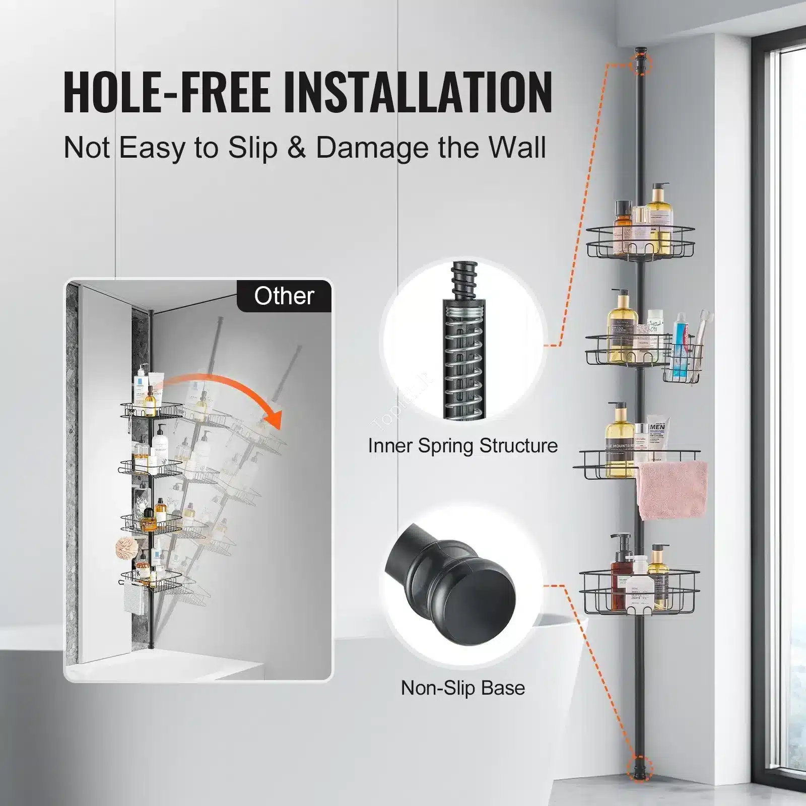 - Montavimas Be Gręžimo: Dėl stiprios spyruoklinės įtempimo technologijos, lentyna tvirtai fiksuojasi tarp grindų ir lubų. Montavimas yra itin paprastas ir taupo tavo laiką.