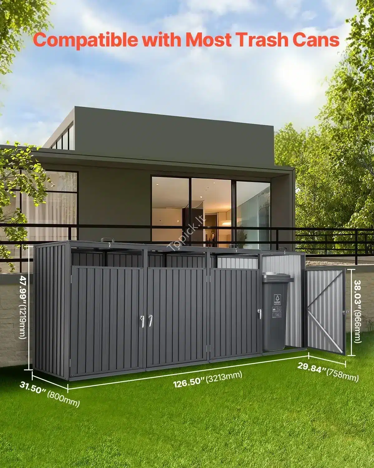 🏠 Erdvė 4 Konteineriams. Ši dėžė sukurta taip, kad talpintų iki keturių 240 litrų šiukšliadėžių. Pagaliau visos atliekos bus tvarkingai paslėptos vienoje vietoje, o tamsiai pilka (RAL7016) spalva puikiai įsilies į bet kokią aplinką.