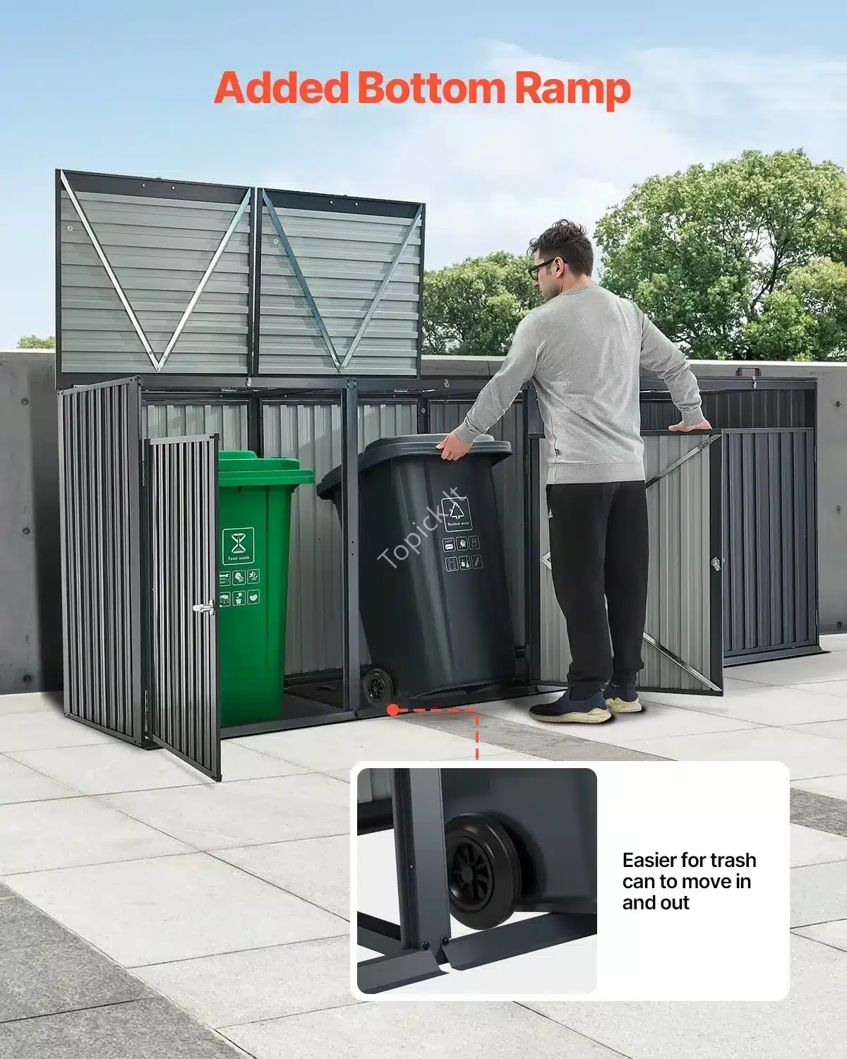⚙️ Patogu Naudoti. Priekyje įrengtas nuožulnus dugnas (rampa), leidžiantis lengvai išvairuoti šiukšliadėžes su ratukais atgal ir priekį. Viršutiniai dangčiai turi rankenas, o atsidaro į viršų, todėl šiukšles gali išmesti tiesiai į konteinerį.