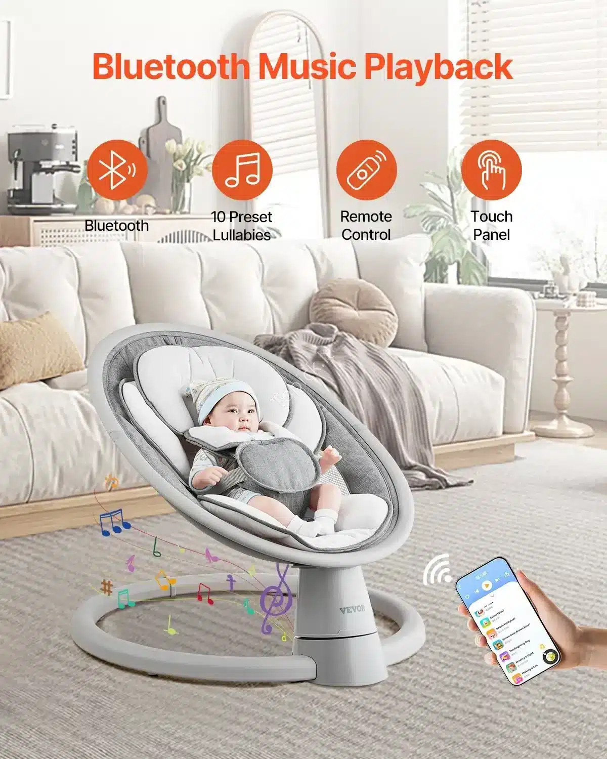 - Muzika per Bluetooth. Išsirink iš 10 iš anksto įrašytų lopšinių arba prijunk savo telefoną per Bluetooth ir paleisk savo mėgstamą raminančią muziką. 🎶