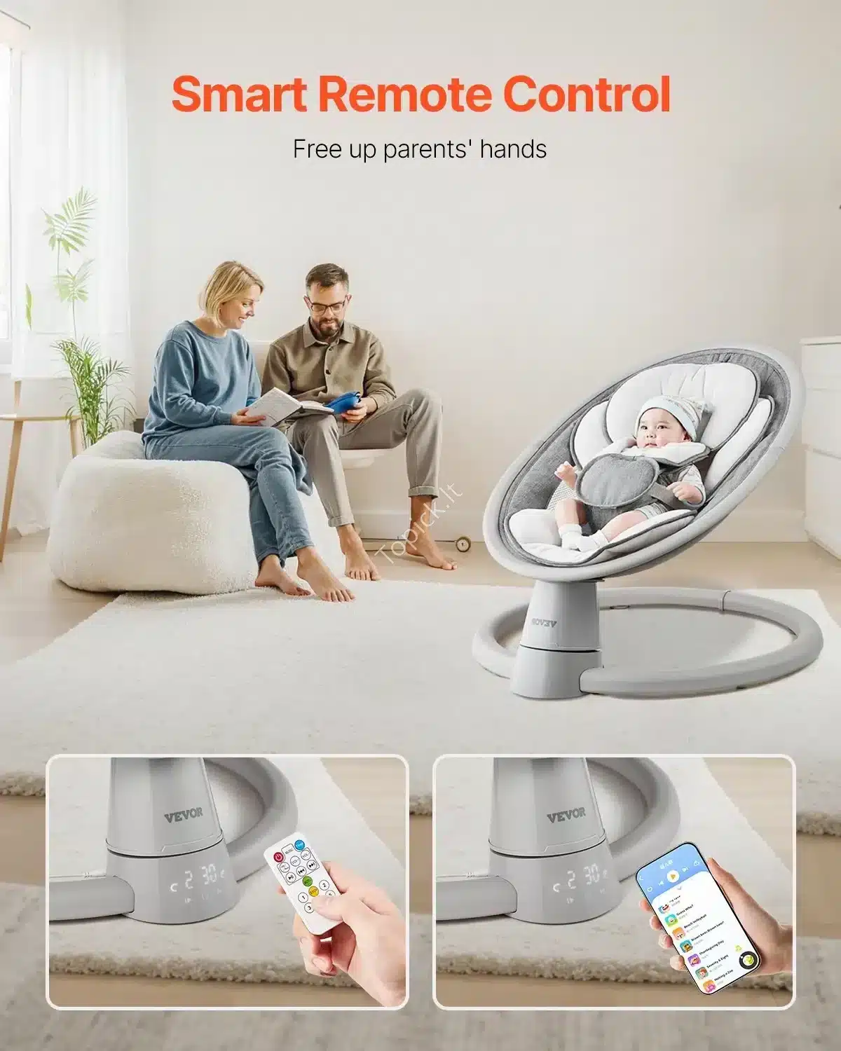 - Nešiojama ir Patogu. Sūpuoklės yra kompaktiškos, lengvai surenkamos, o sveria tik 3,0 kg. Gali būti maitinamos 4 AAA baterijomis (į komplektą neįeina), per USB pakrovimo banką arba 2 metrų maitinimo laidu. Tinka naudoti ir namuose, ir išvykose!