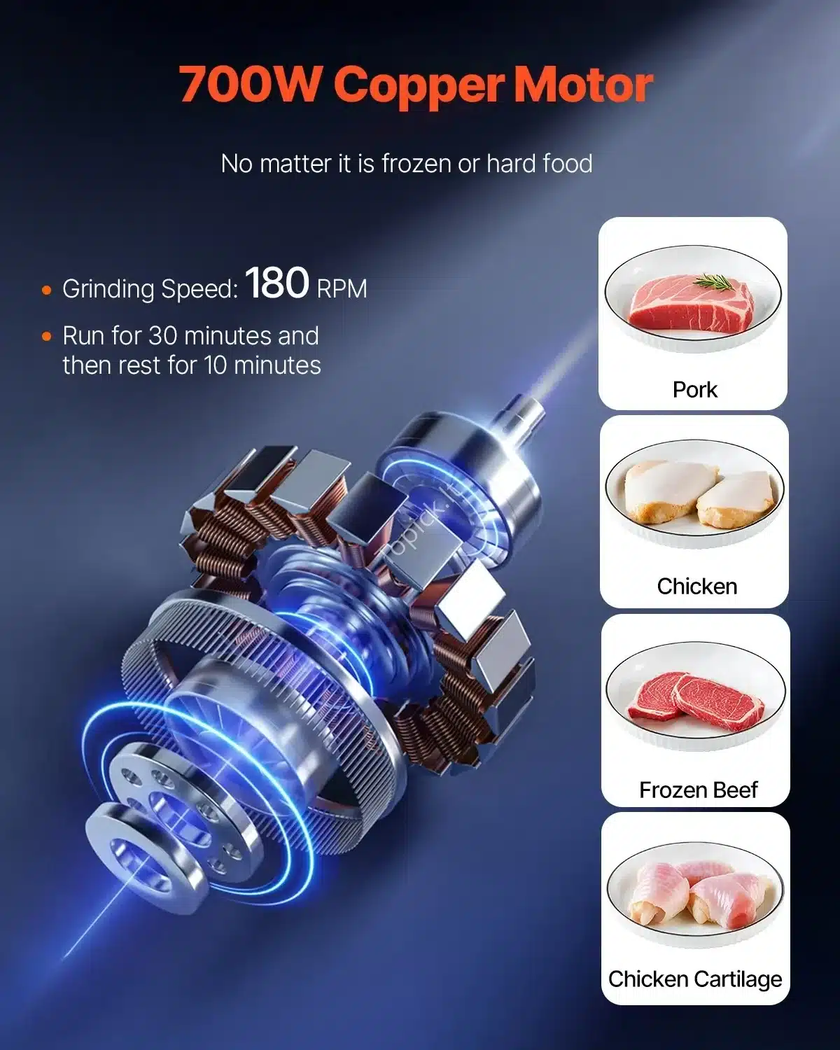 🛠️ Galingas 700 W variklis – užtikrina greitą ir efektyvų mėsos malimą bei dešrų pildymą.
